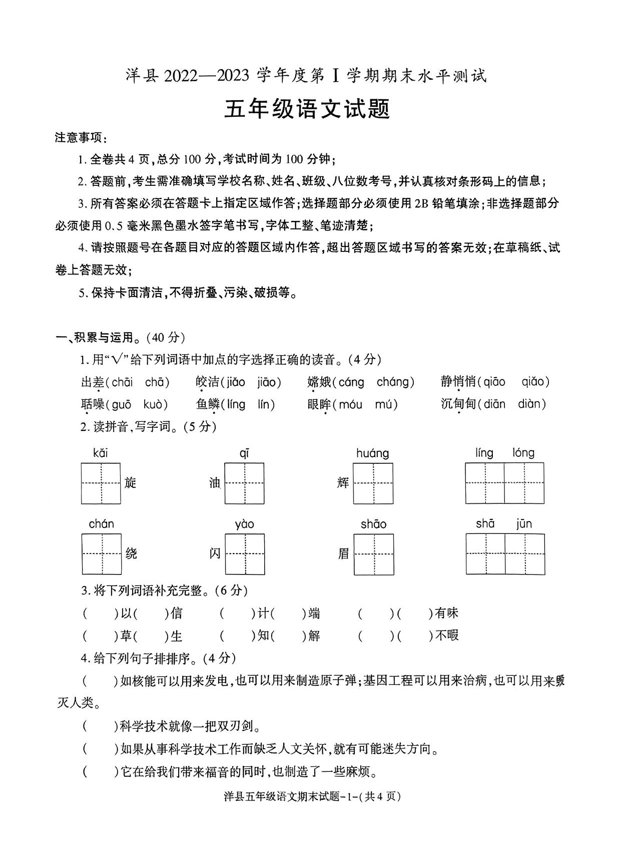 陕西省汉中市洋县2022-2023学年度第一学期期末水平测试试题五年级语文(人教版)