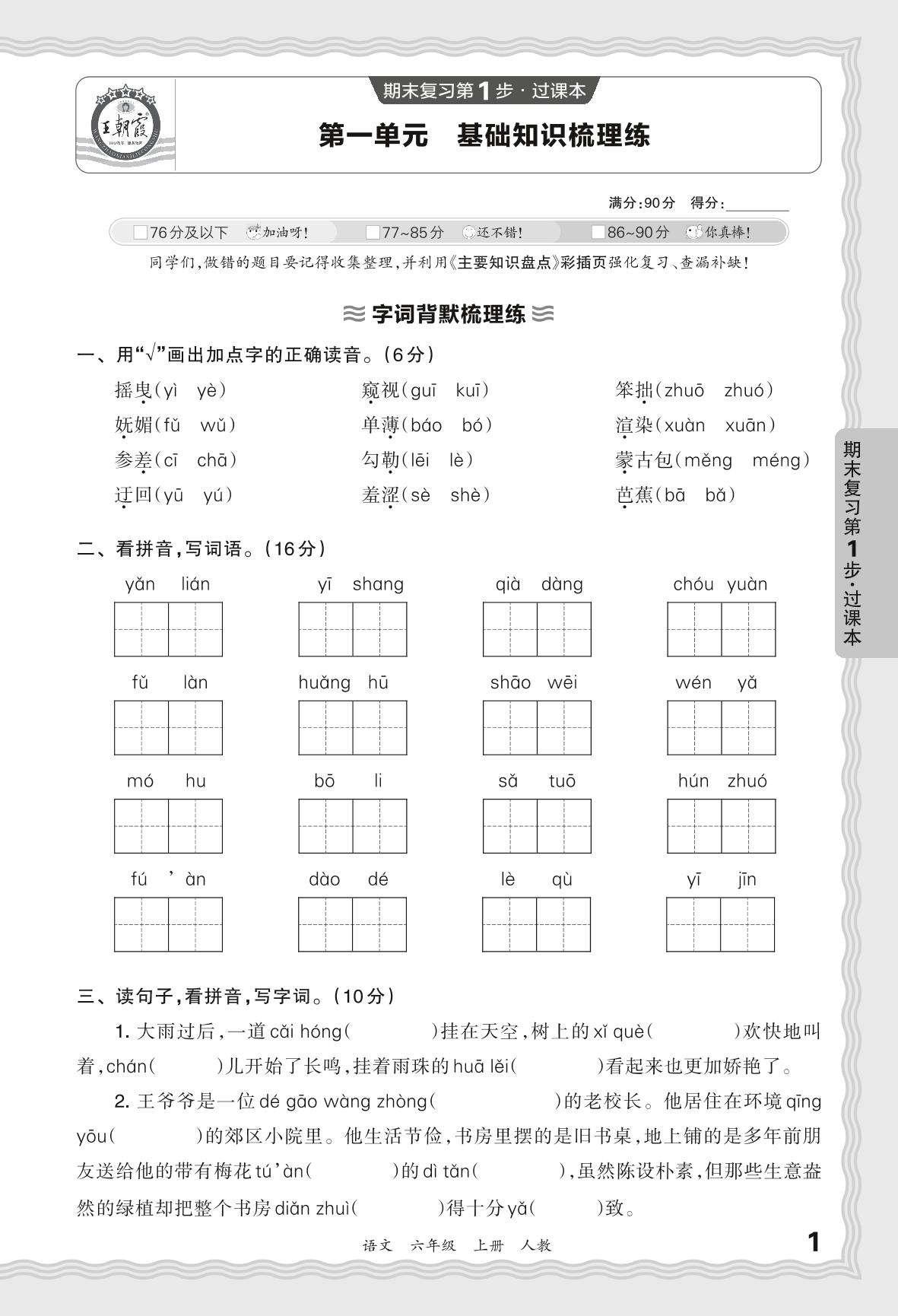 2023上册六年级语文人教版 期末过课本QMA版·第一单元 基础知识梳理练