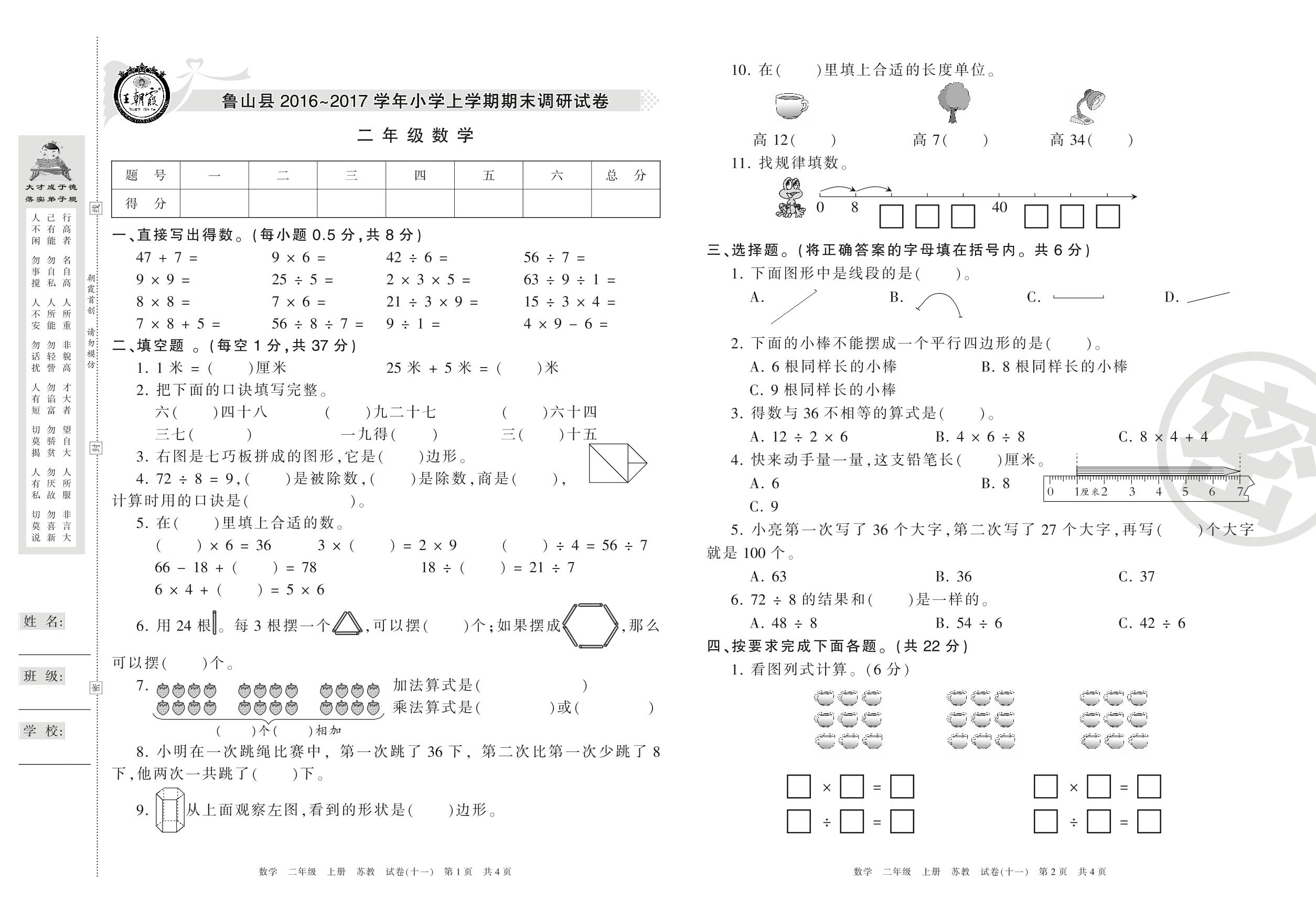 2016-2017学年第一学期平顶山市鲁山县二年级数学试卷(苏教版)【11】
