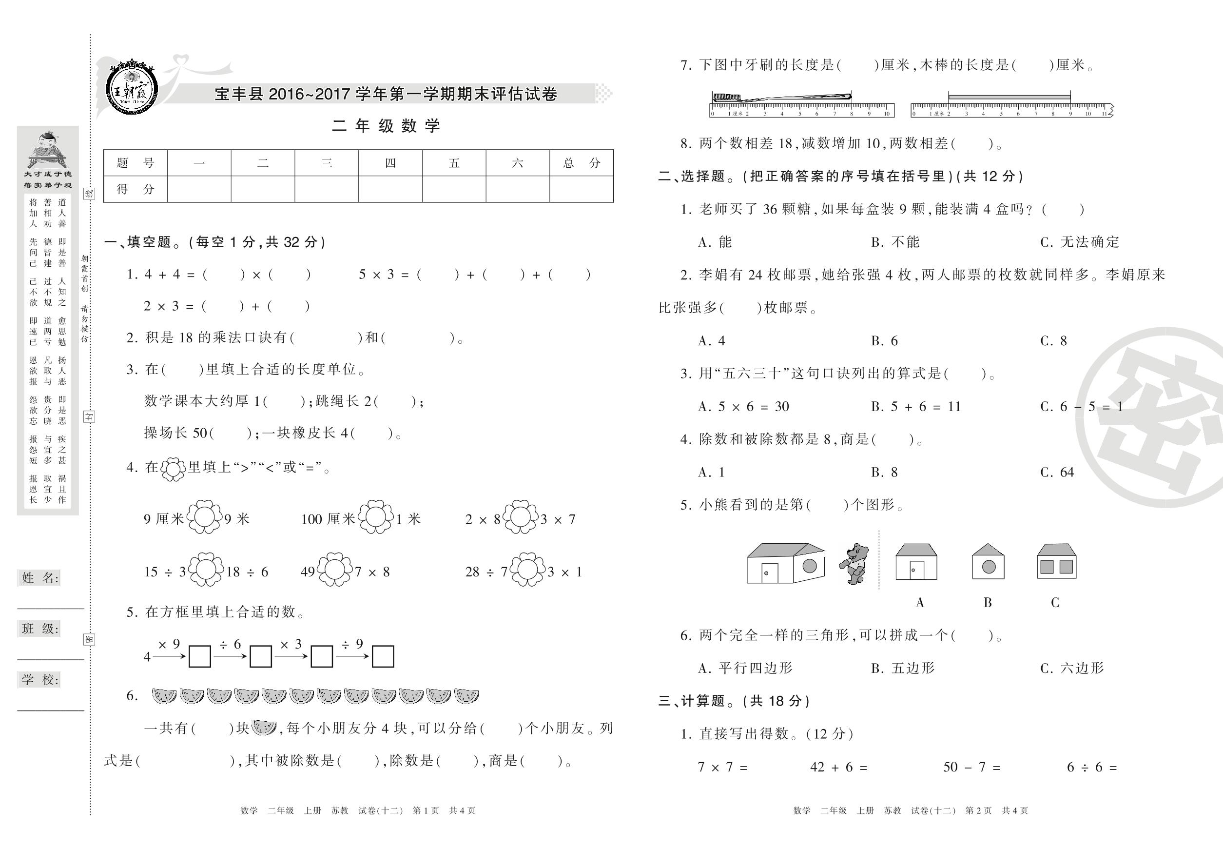2016-2017学年第一学期平顶山市宝丰县二年级数学试卷(苏教版)【12】