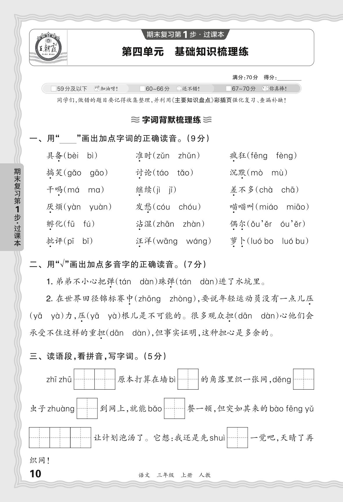 2023秋上册三年级语文人教版 期末过课本QMA版·第四单元 基础知识梳理练