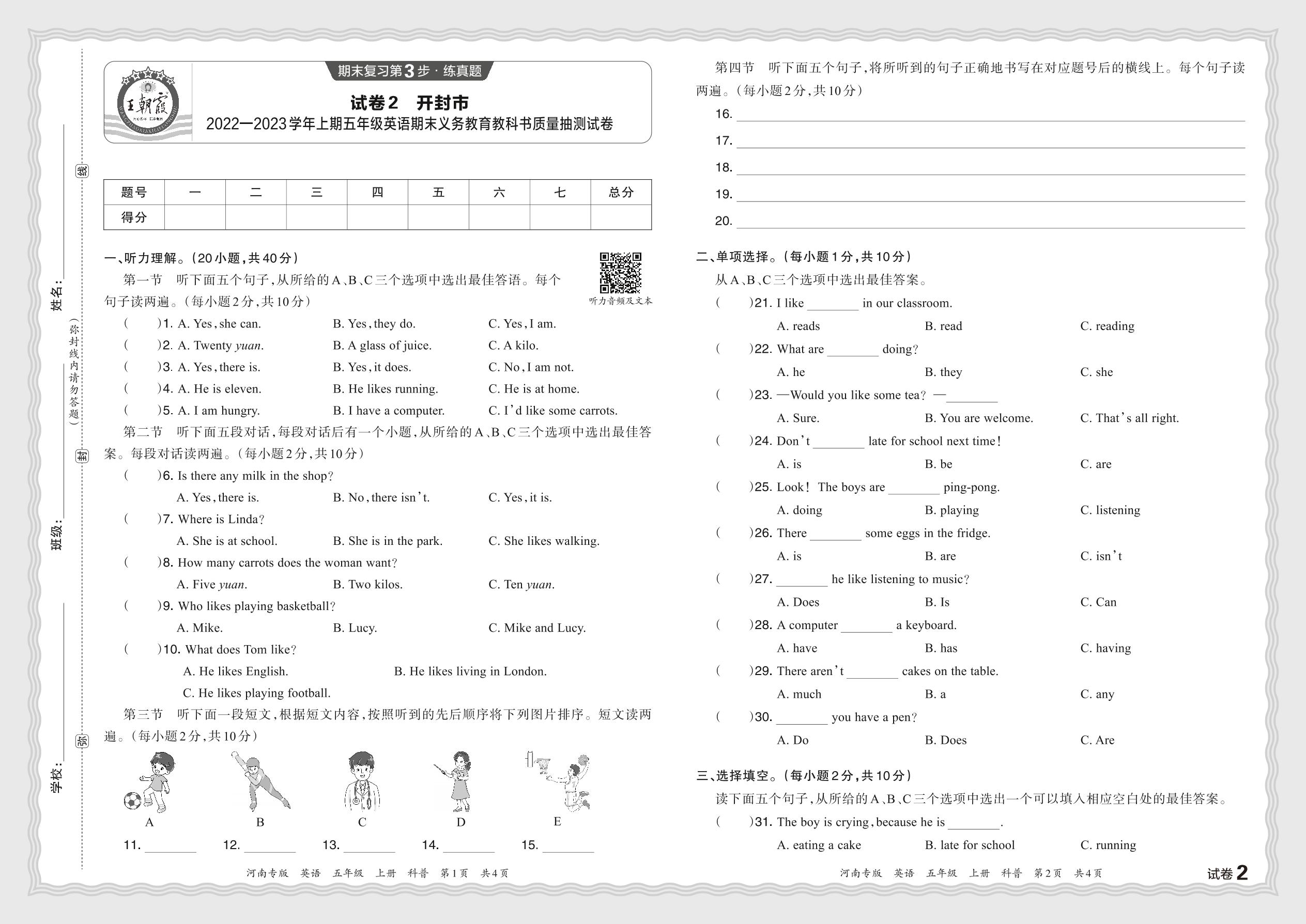 河南省开封市2022—2023学年上期五年级英语期末义务教育教科书质量抽测试卷【2】