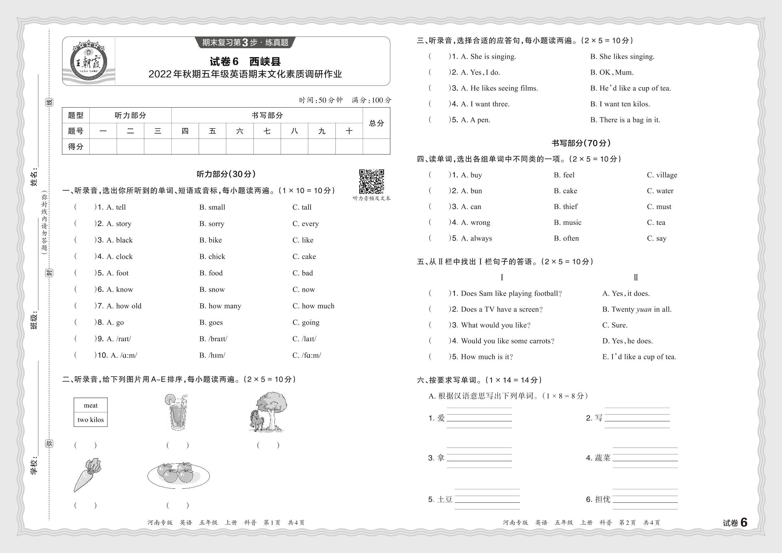 河南省南阳市西峡县2022年秋期五年级英语期末文化素质调研作业【6】