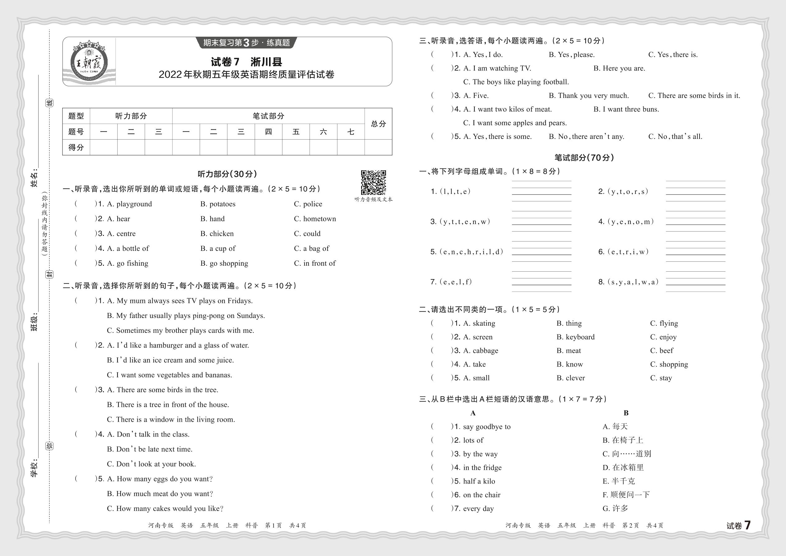 河南省南阳市淅川县2022年秋期五年级英语期终质量评估试卷【7】