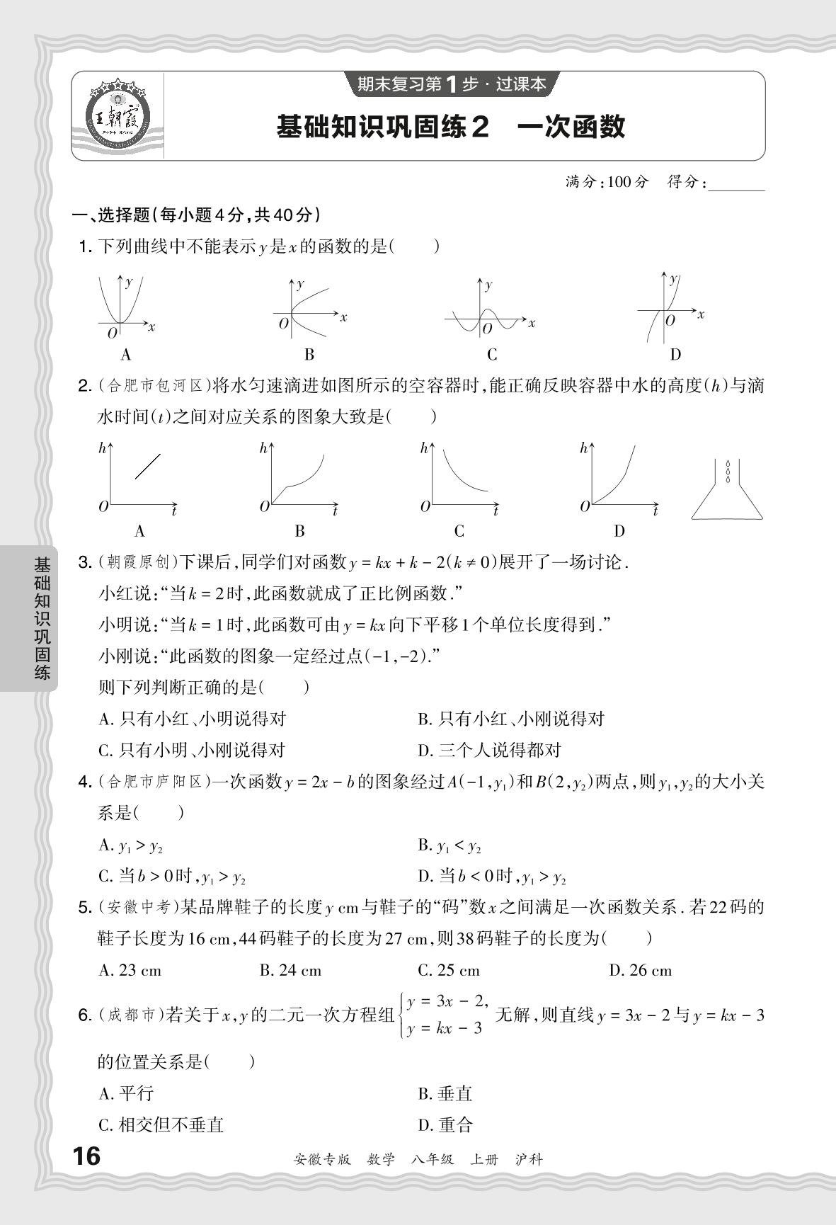 2023秋上册八年级数学沪科版 期末过课本·基础知识巩固练 一次函数【2】