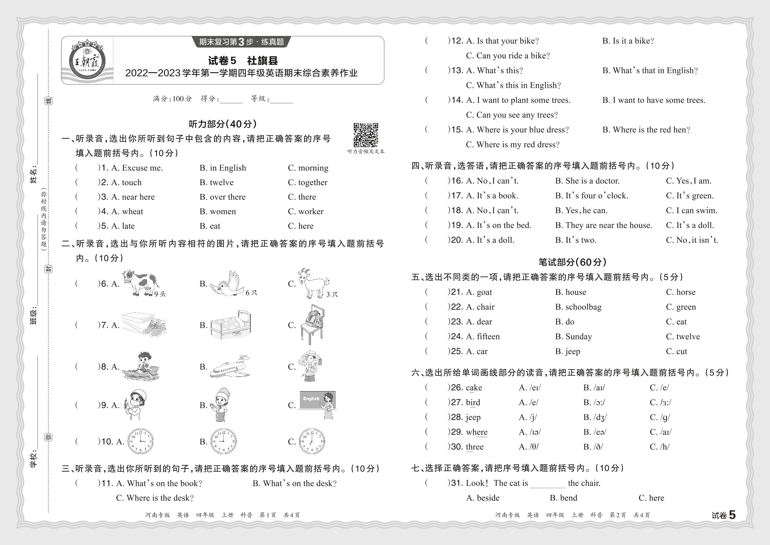 四年级英语科普版上册期末卷