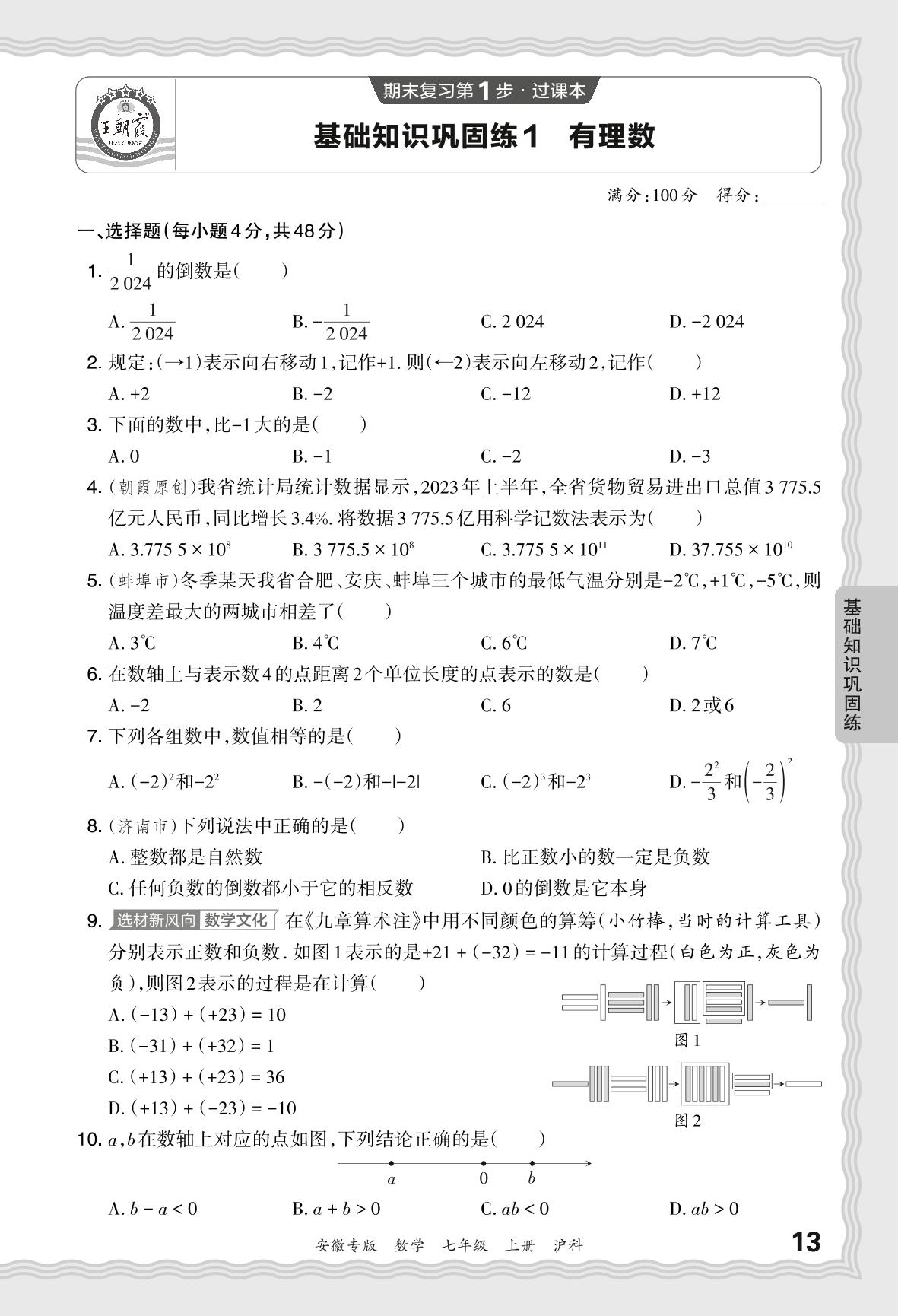 2023秋上册七年级数学沪科版 期末过课本·基础知识巩固练 有理数【1】