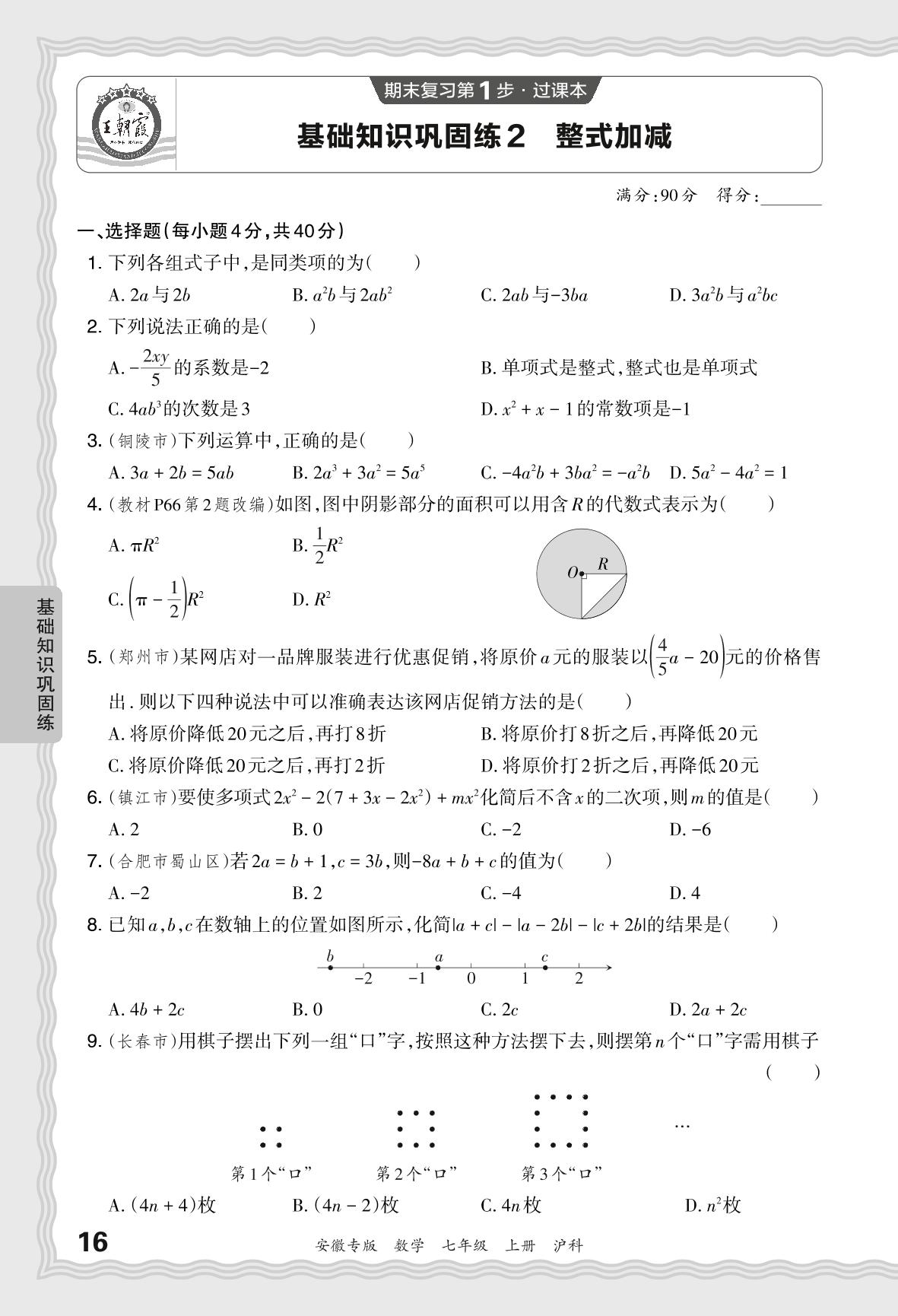 2023秋上册七年级数学沪科版 期末过课本·基础知识巩固练 整式加减【2】
