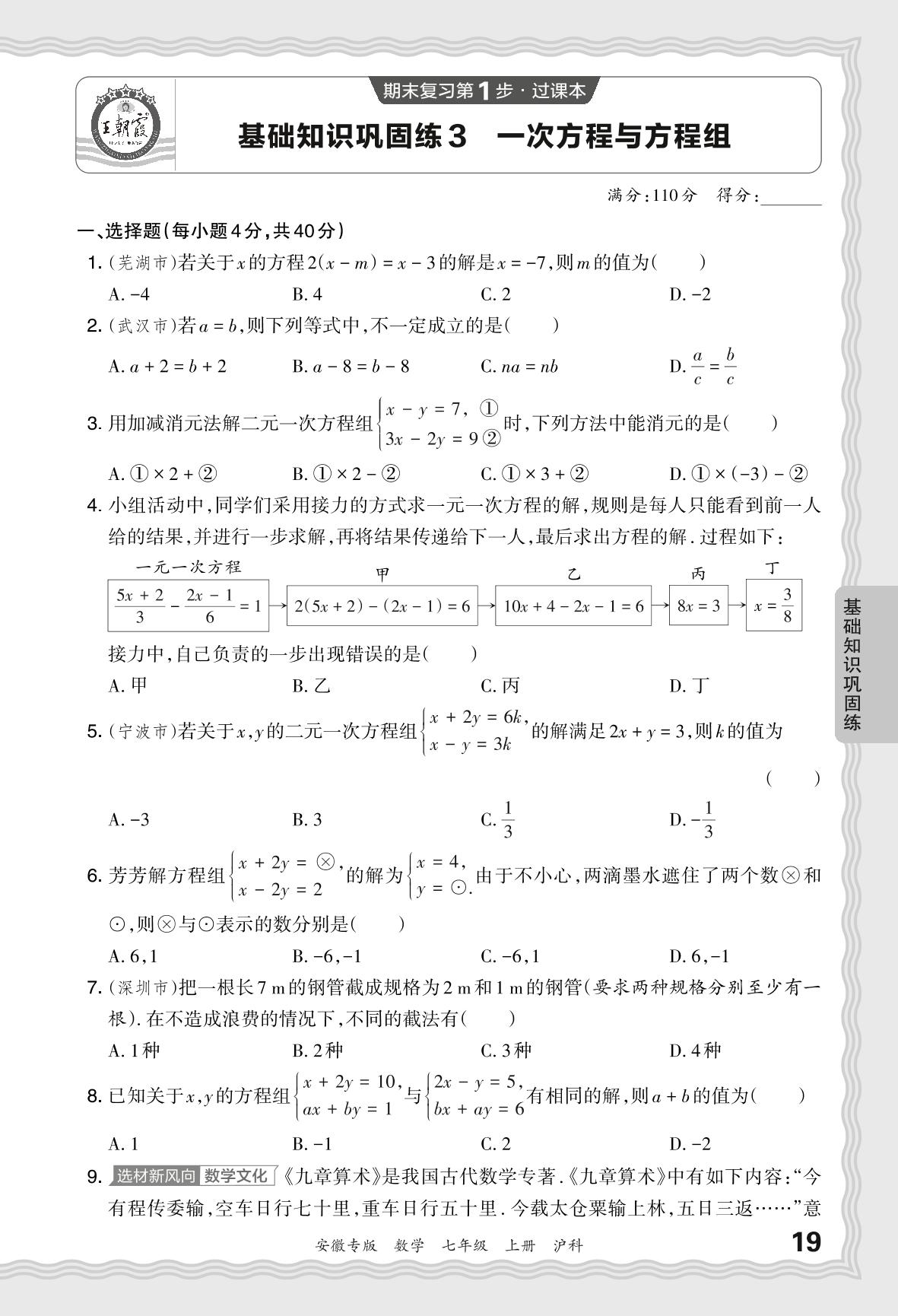 2023秋上册七年级数学沪科版 期末过课本·基础知识巩固练 一次方程与方程组【3】
