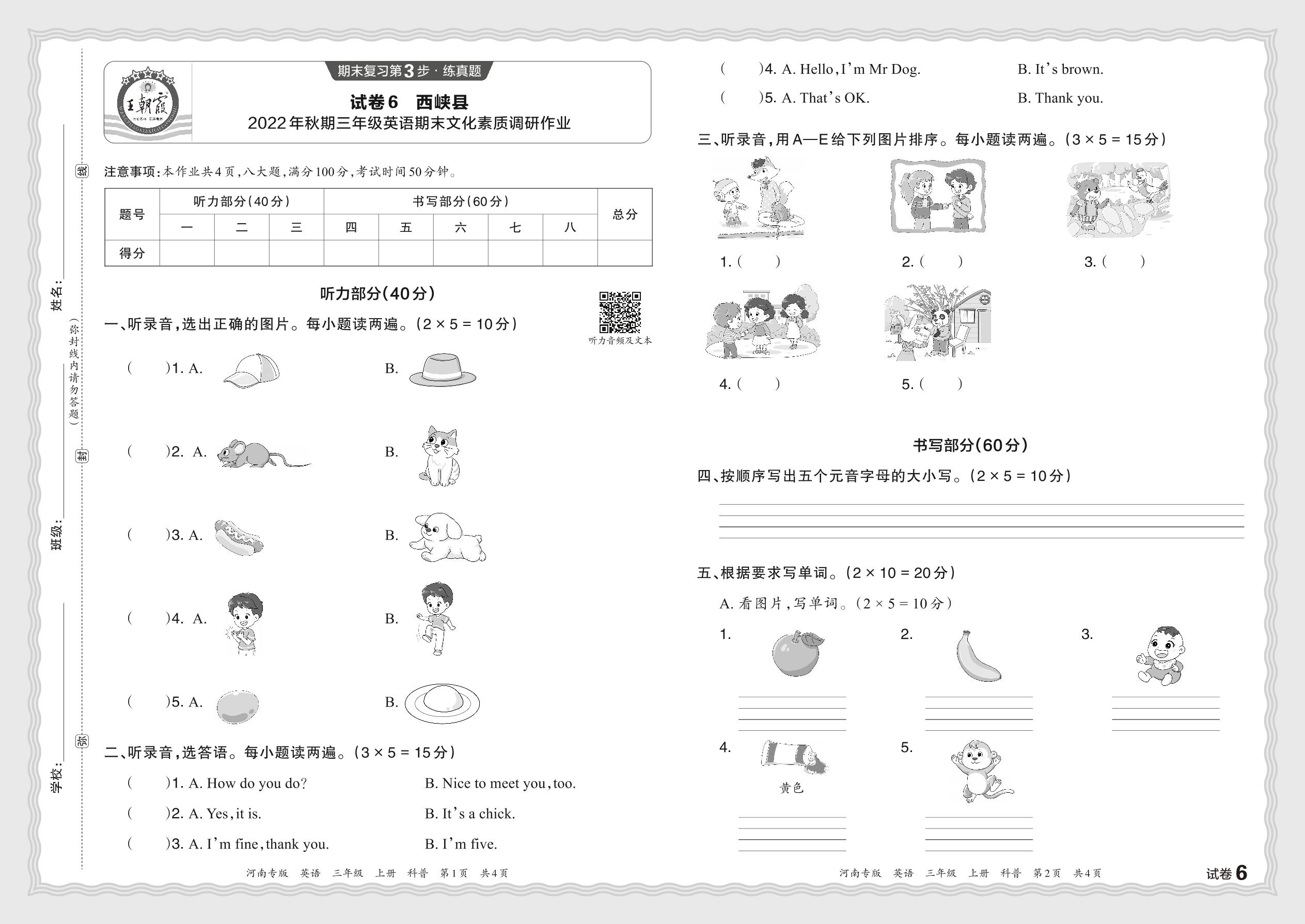 河南省南阳市西峡县2022年秋期三年级英语期末文化素质调研作业【6】