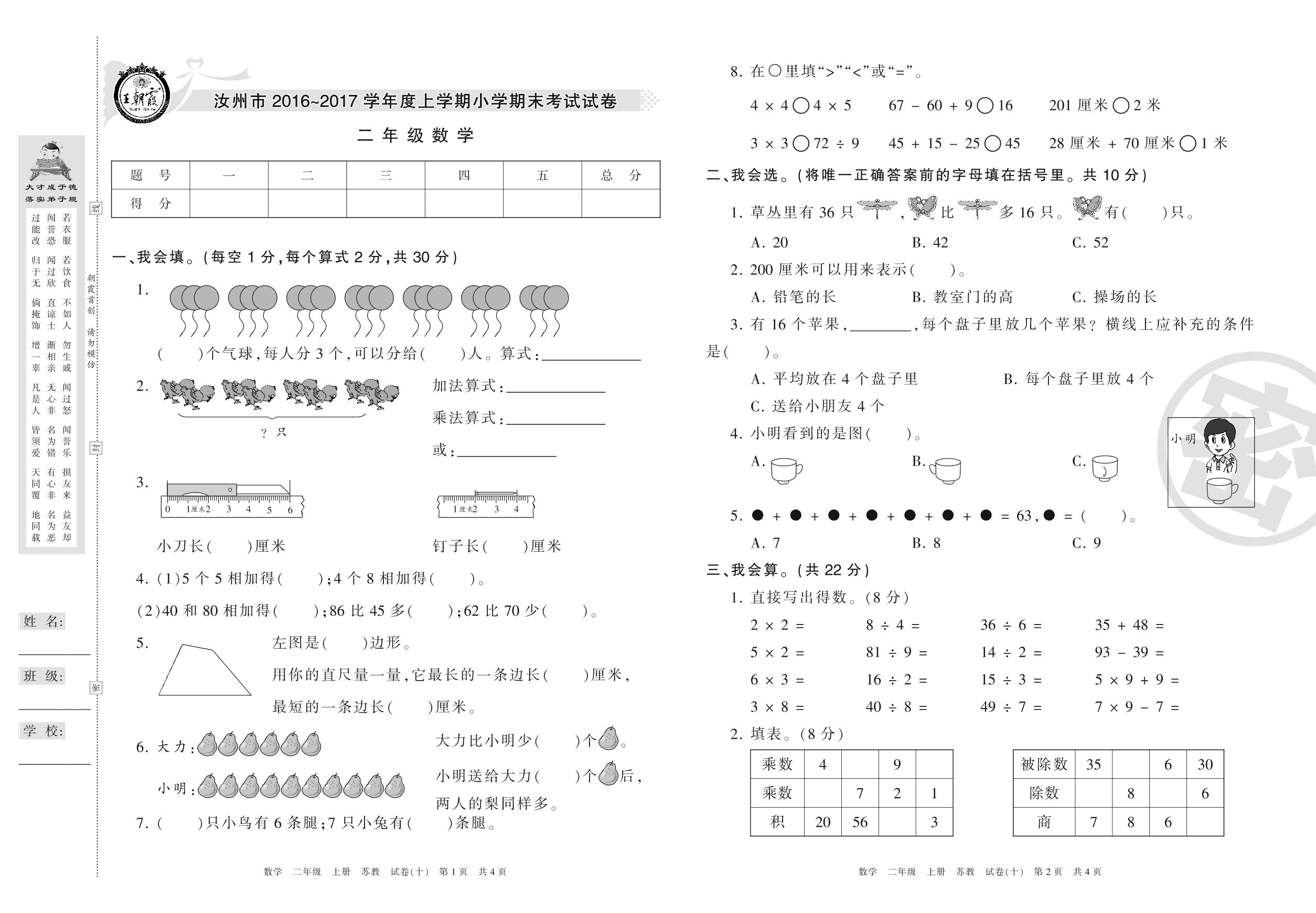 2016-2017学年第一学期汝州市二年级数学试卷(苏教版)【10】