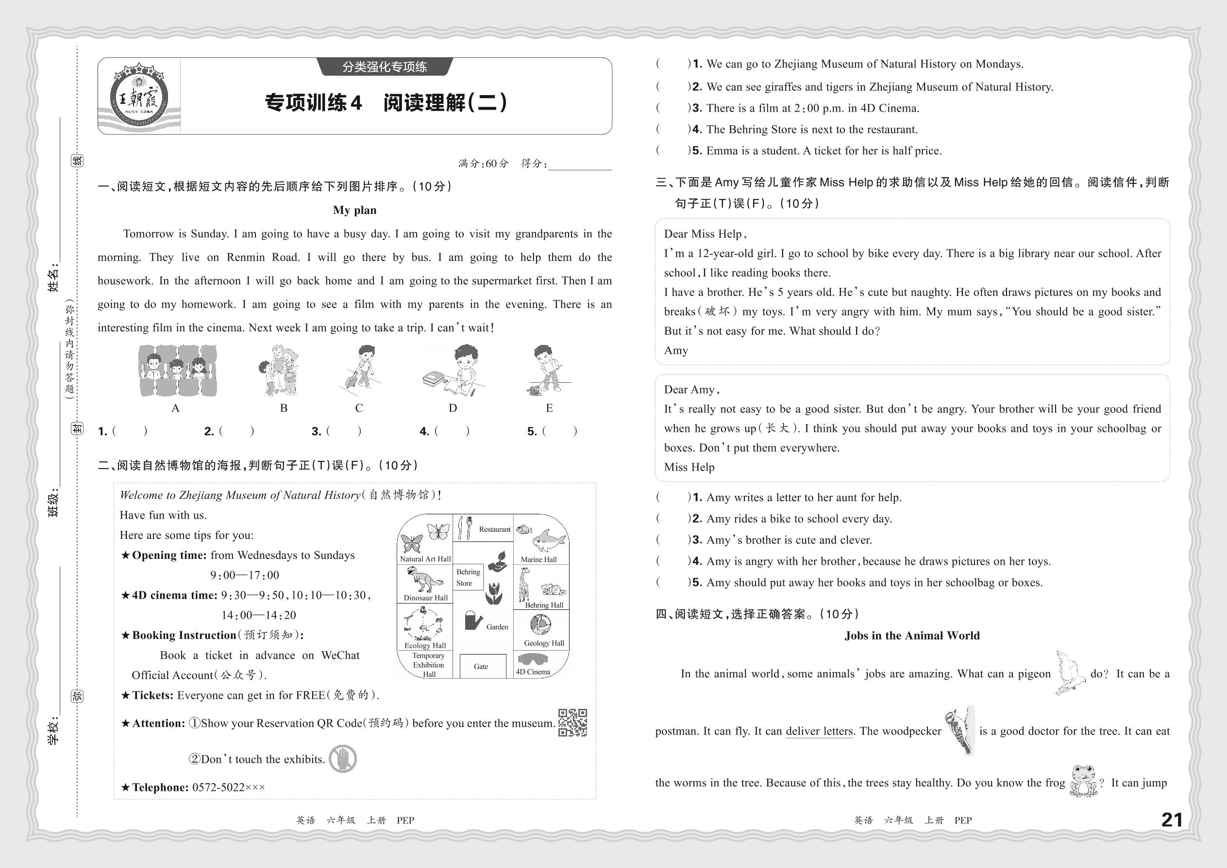 2023秋上册六年级英语人教PEP版 期末专项·阅读理解(二)【4】