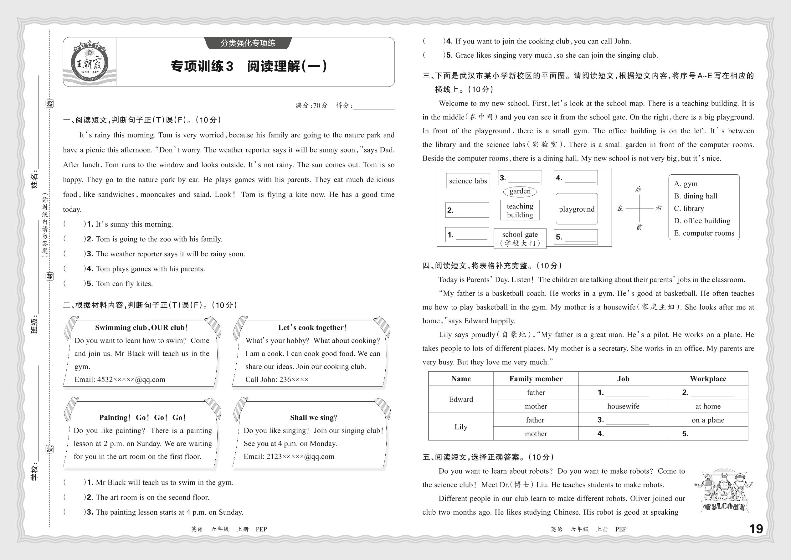 2023秋上册六年级英语人教PEP版 期末专项·阅读理解(一)【3】