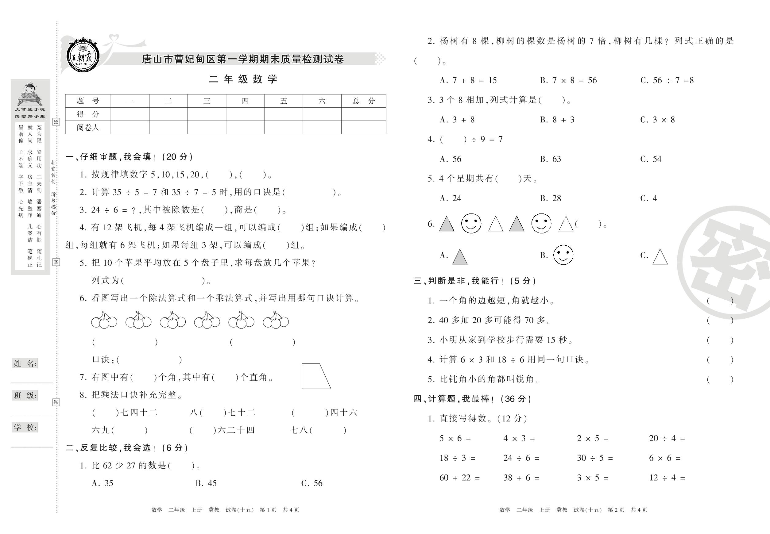 2016-2017学年第一学期唐山市曹妃甸区二年级数学试卷(冀教版)【15】