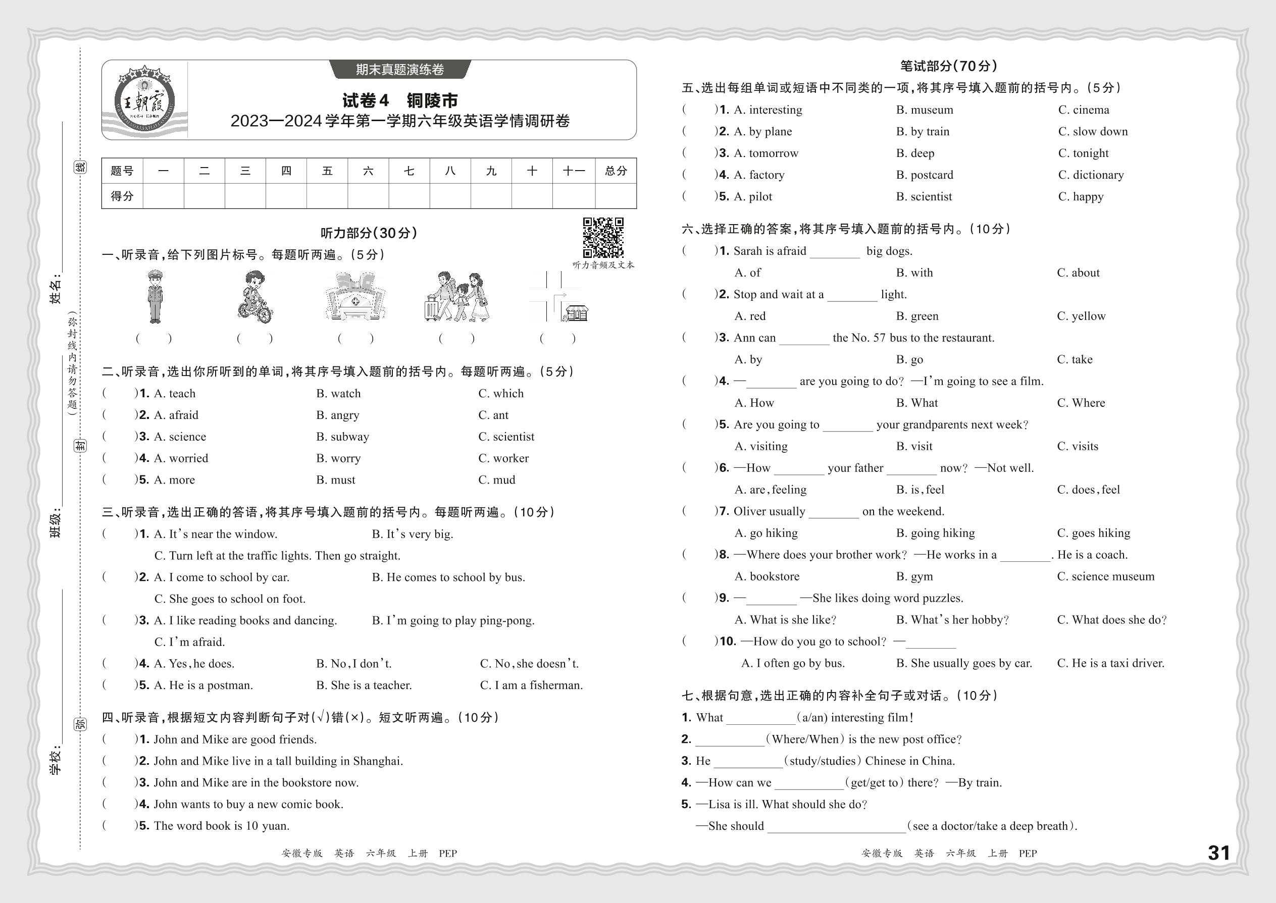 安徽省铜陵市2023—2024学年第一学期六年级英语学情调研卷(PEP版)【4】