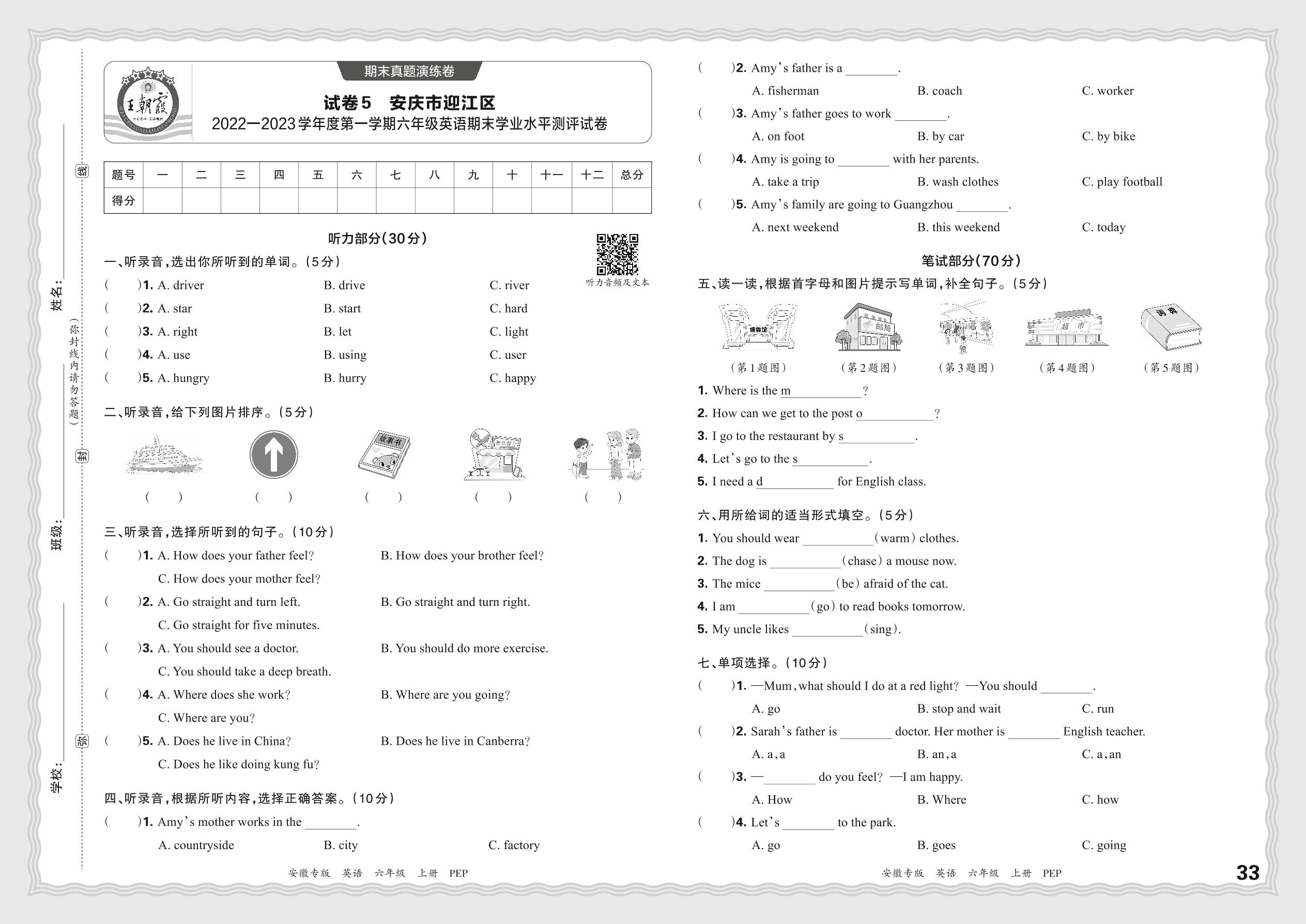 安徽省安庆市迎江区2022—2023学年度第一学期六年级英语期末学业水平测评试卷(PEP版)【5】