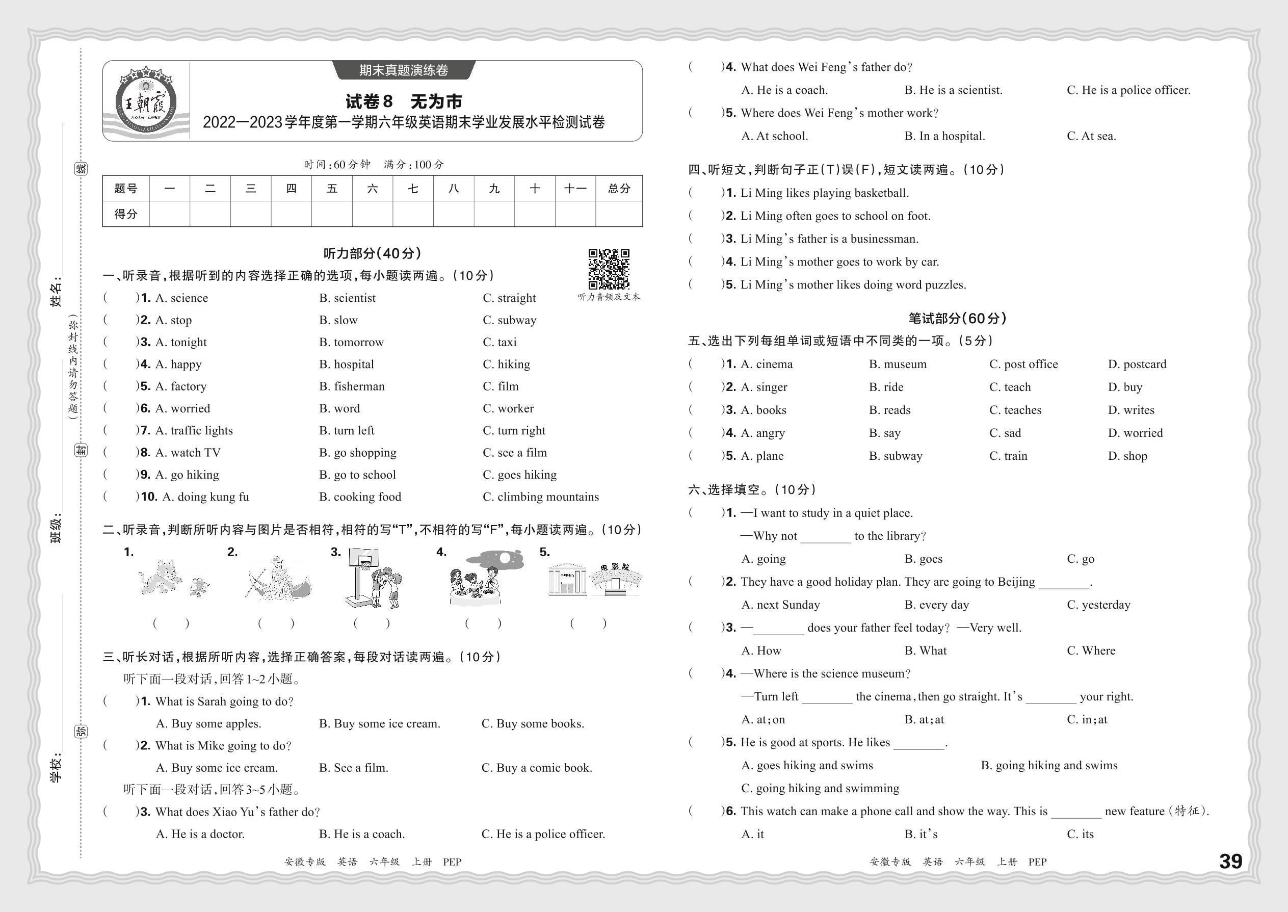 安徽省芜湖市无为市2022—2023学年度第一学期六年级英语期末学业发展水平检测试卷(PEP版)【8】