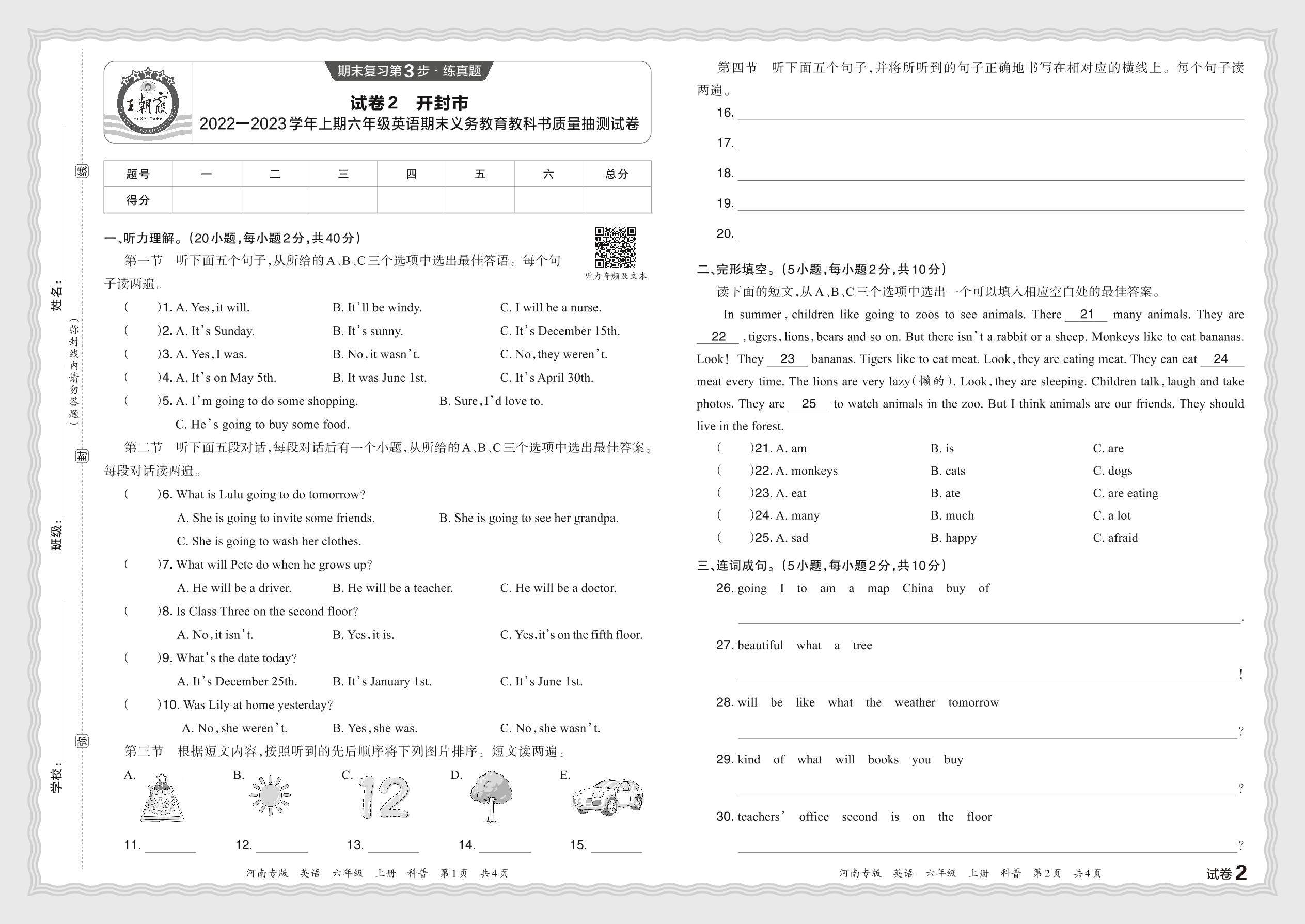 河南省开封市2022—2023学年上期六年级英语期末义务教育教科书质量抽测试卷【2】