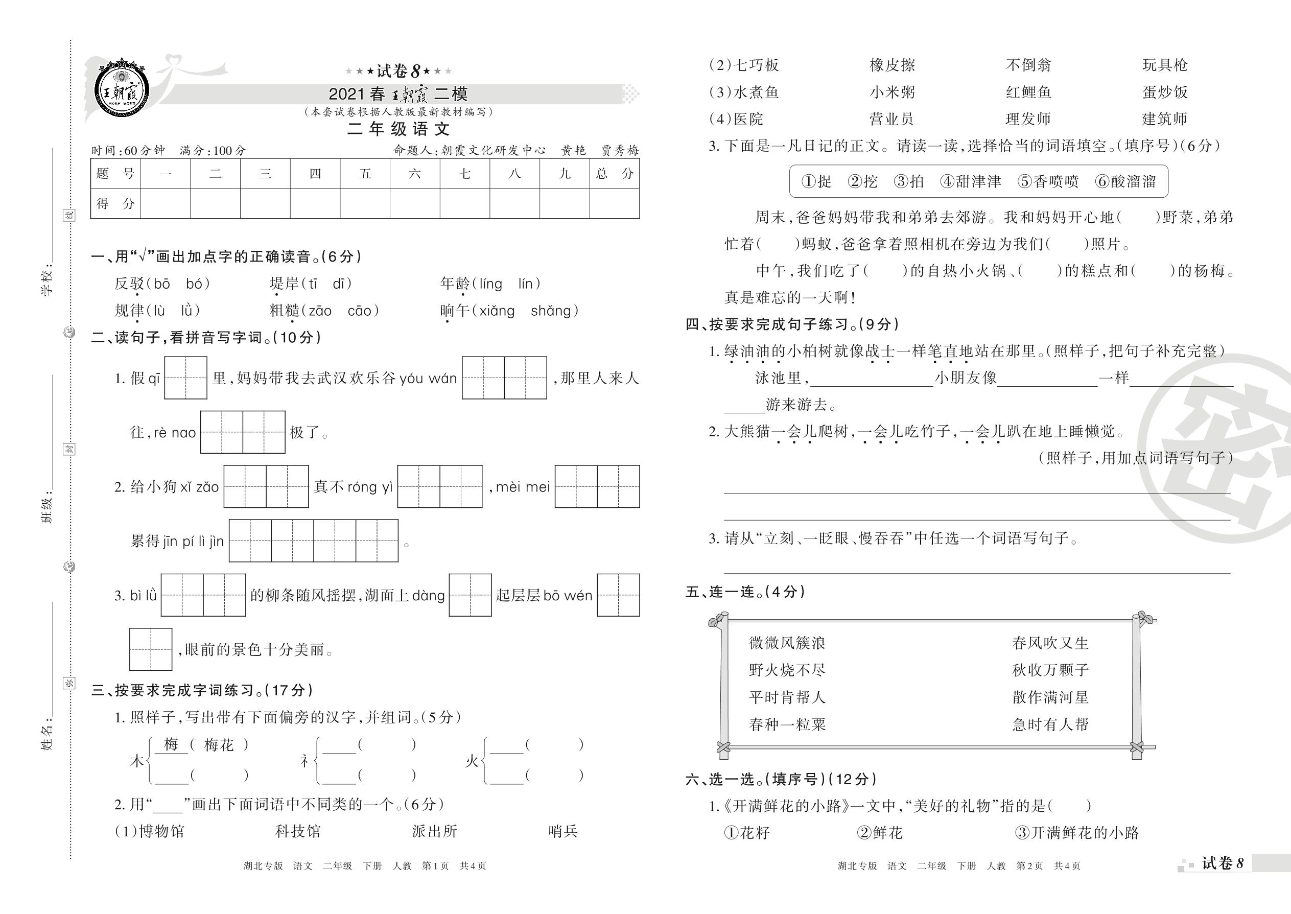 王朝霞期末模拟卷二年级下册语文(人教版)_R21080163640【8】