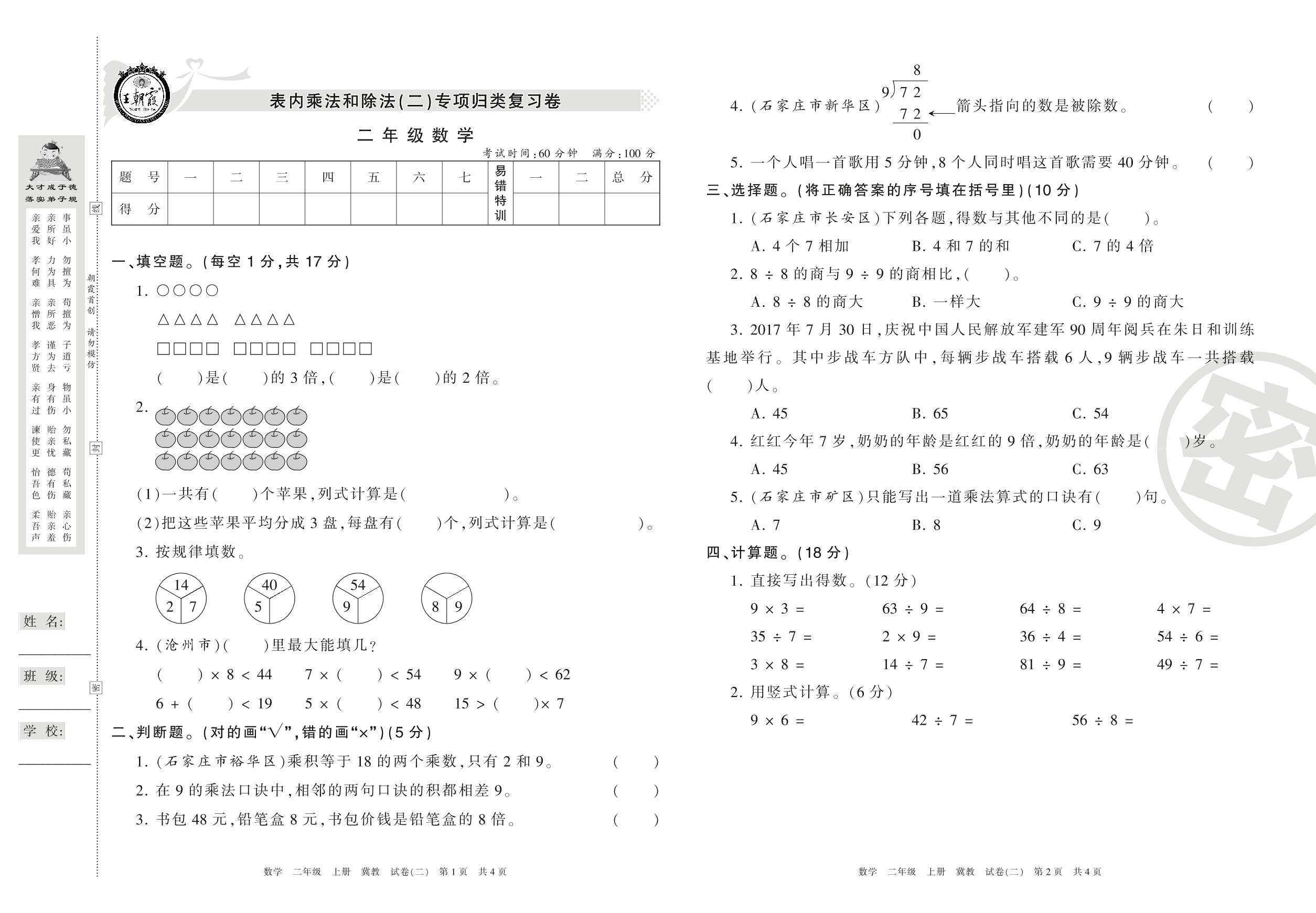 王朝霞期末专项卷二年级上册数学(冀教版)【2】