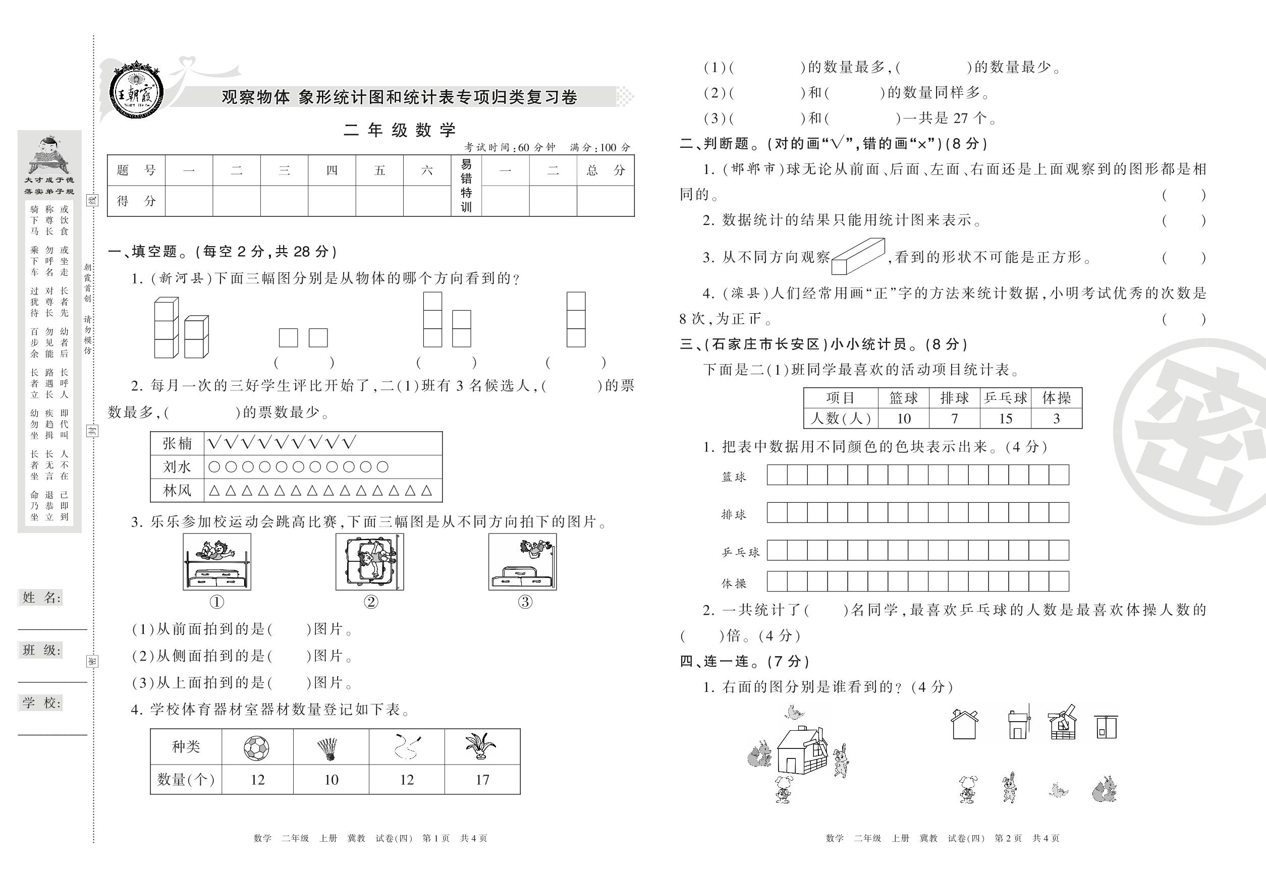 王朝霞期末专项卷二年级上册数学(冀教版)【4】