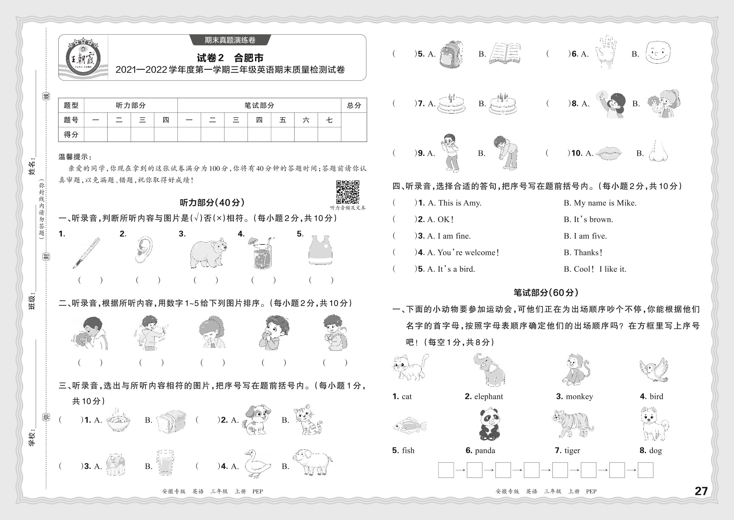 安徽省合肥市2021—2022学年度第一学期三年级英语期末发展绿色指标评价测试试题卷(PEP版)【2】