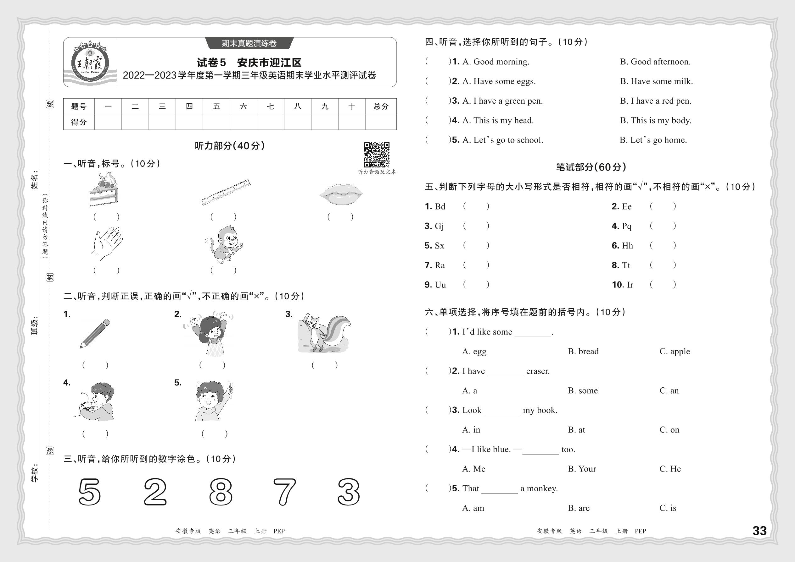 安徽省安庆市迎江区2022—2023学年度第一学期三年级英语期末学业水平测评试卷(PEP版)【5】