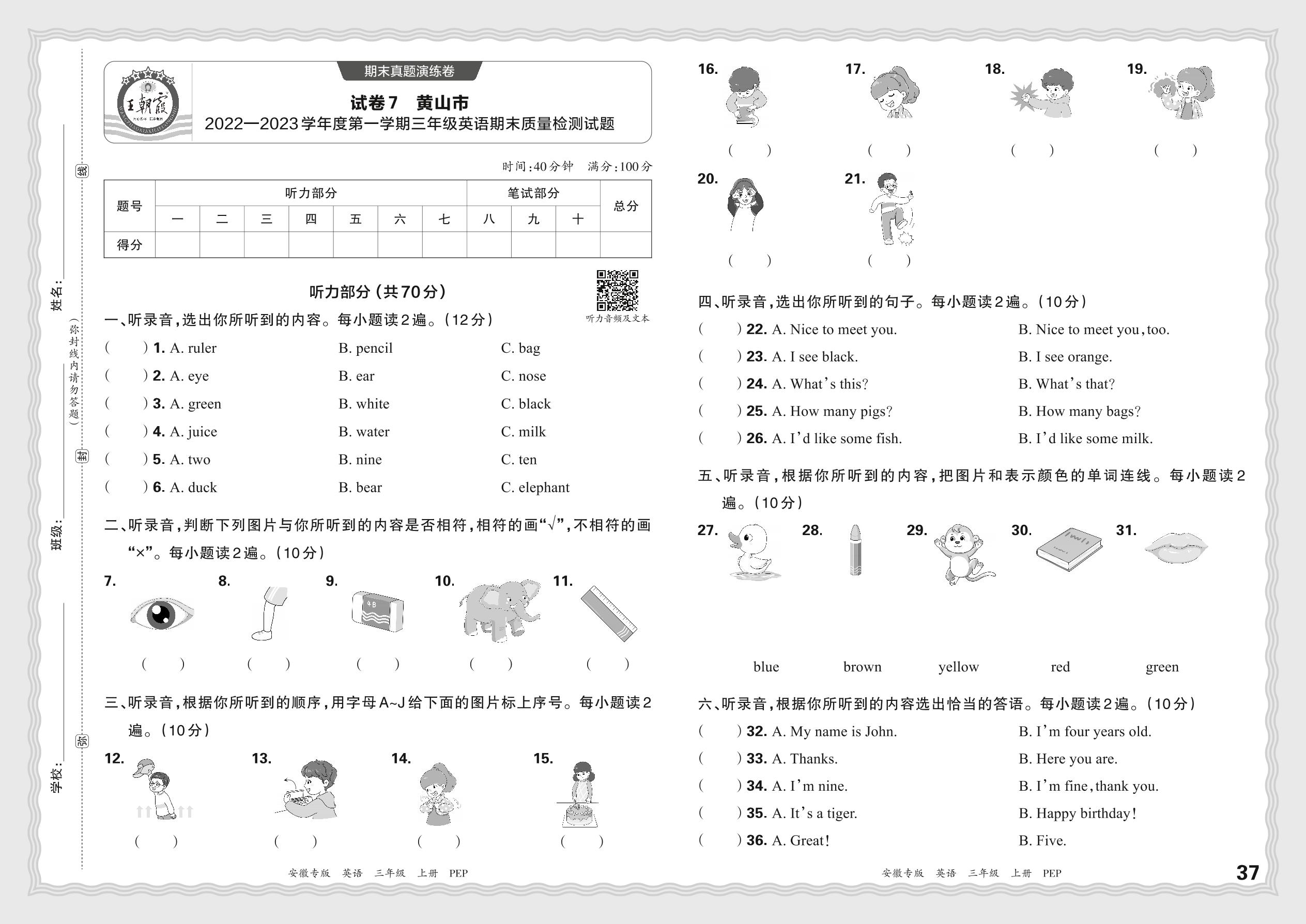 安徽省黄山市2022—2023学年度第一学期三年级英语期末质量检测试题(PEP版)【7】