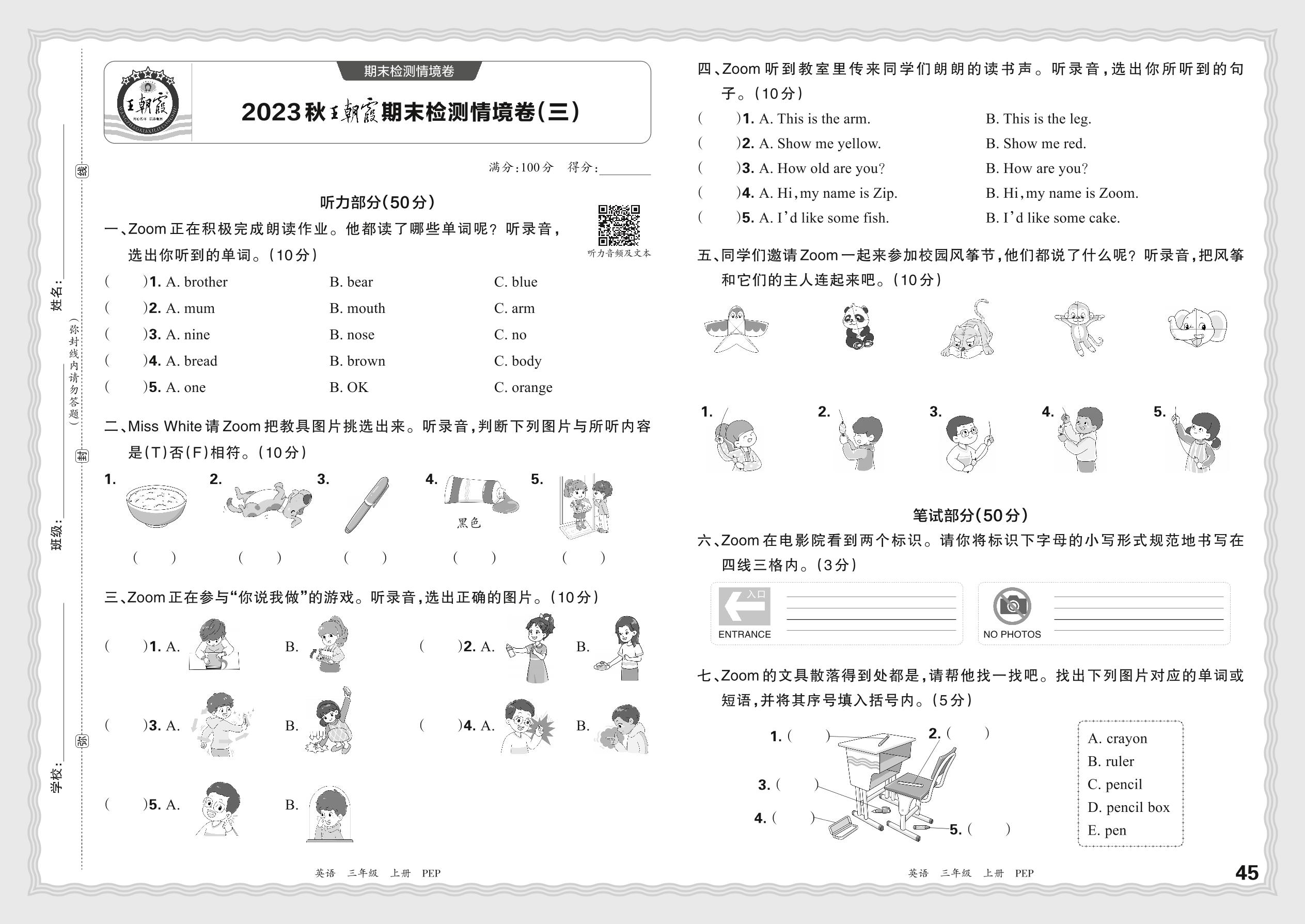 2023秋上册三年级英语人教PEP版 王朝霞期末检测情境卷(三)