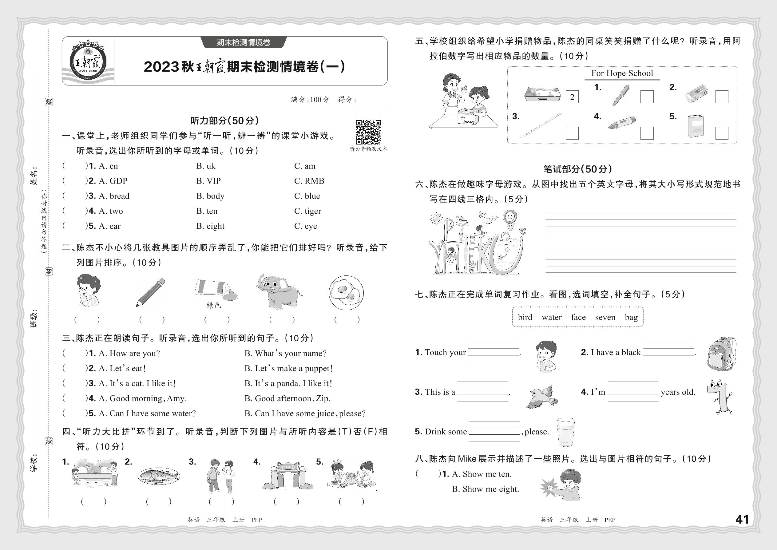 2023秋上册三年级英语人教PEP版 王朝霞期末检测情境卷(一)