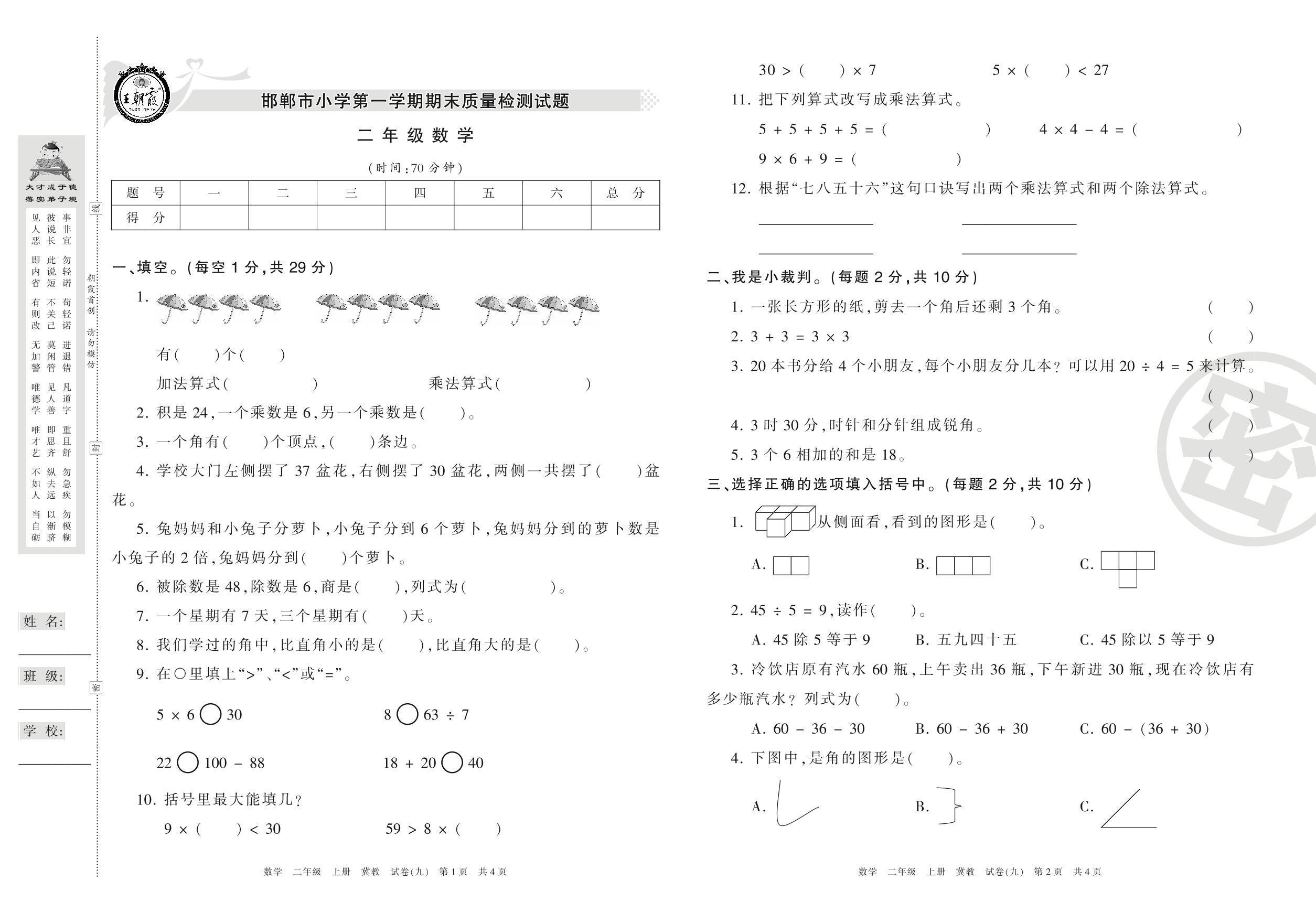 2016-2017学年第一学期邯郸市二年级数学试卷(冀教版)【9】
