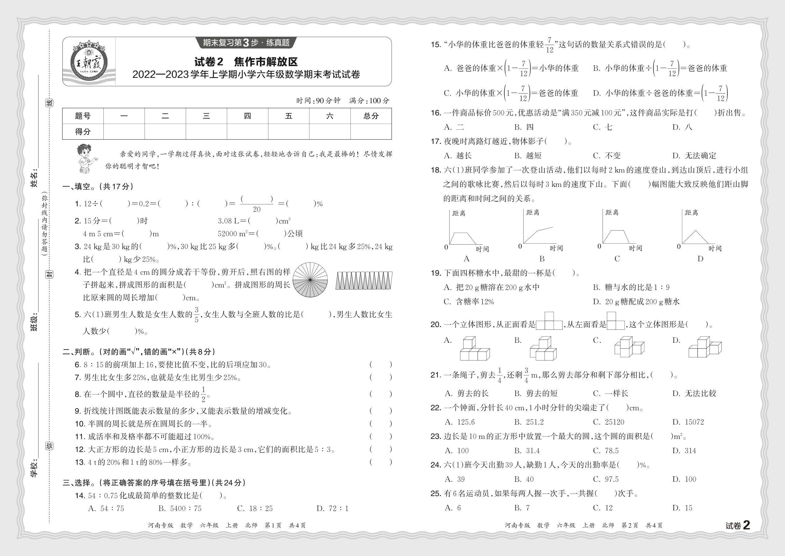 河南省焦作市解放区2022—2023学年上学期小学六年级数学期末考试试卷(北师版)【2】