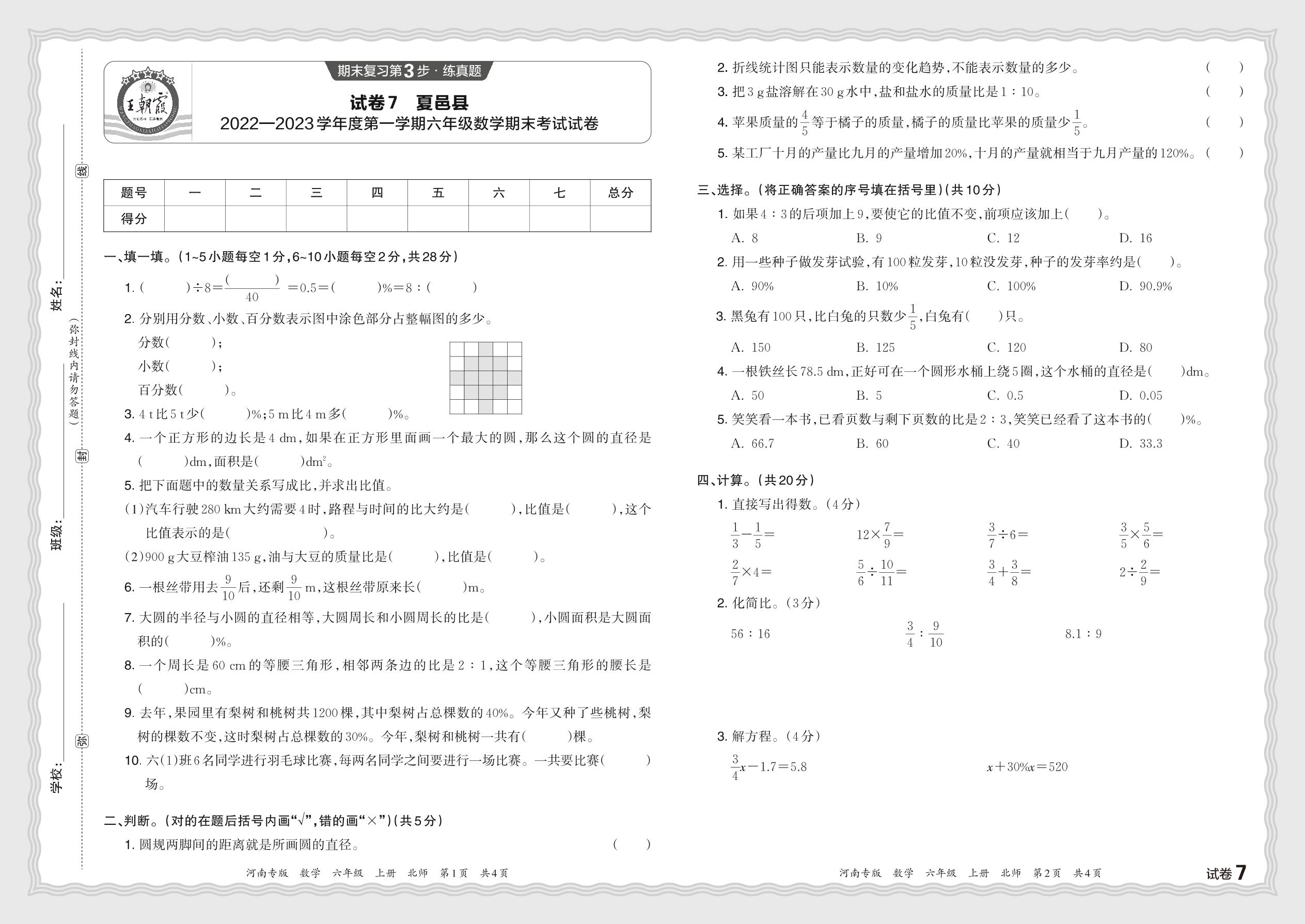 河南省商丘市夏邑县2022—2023学年度第一学期六年级数学期末考试试卷(北师版)【7】