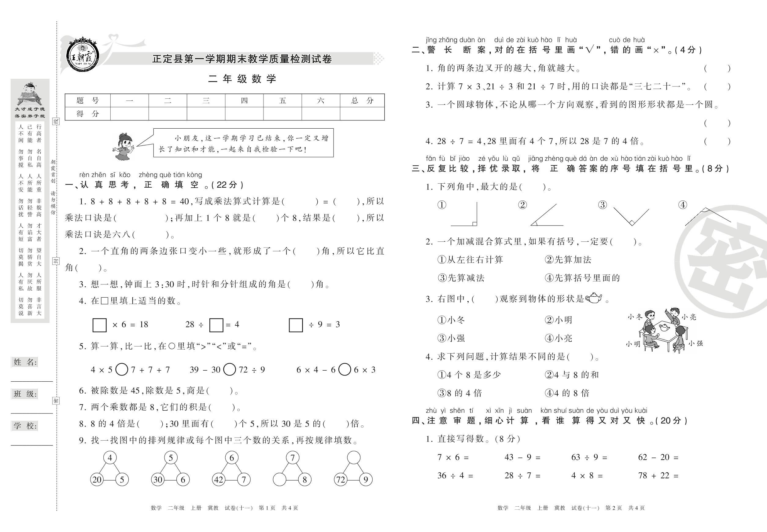 2016-2017学年第一学期石家庄市正定县二年级数学试卷(冀教版)【11】