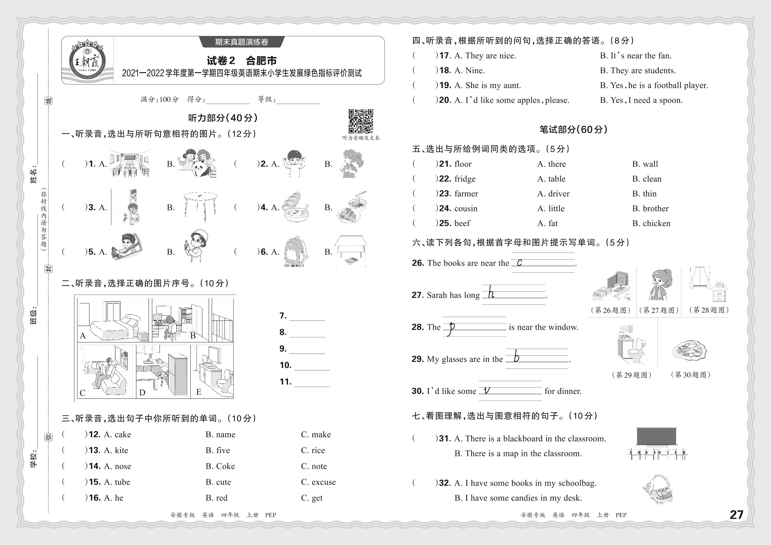 安徽省合肥市2021—2022学年度第一学期四年级英语期末发展绿色指标评价测试试题卷(PEP版)【2】