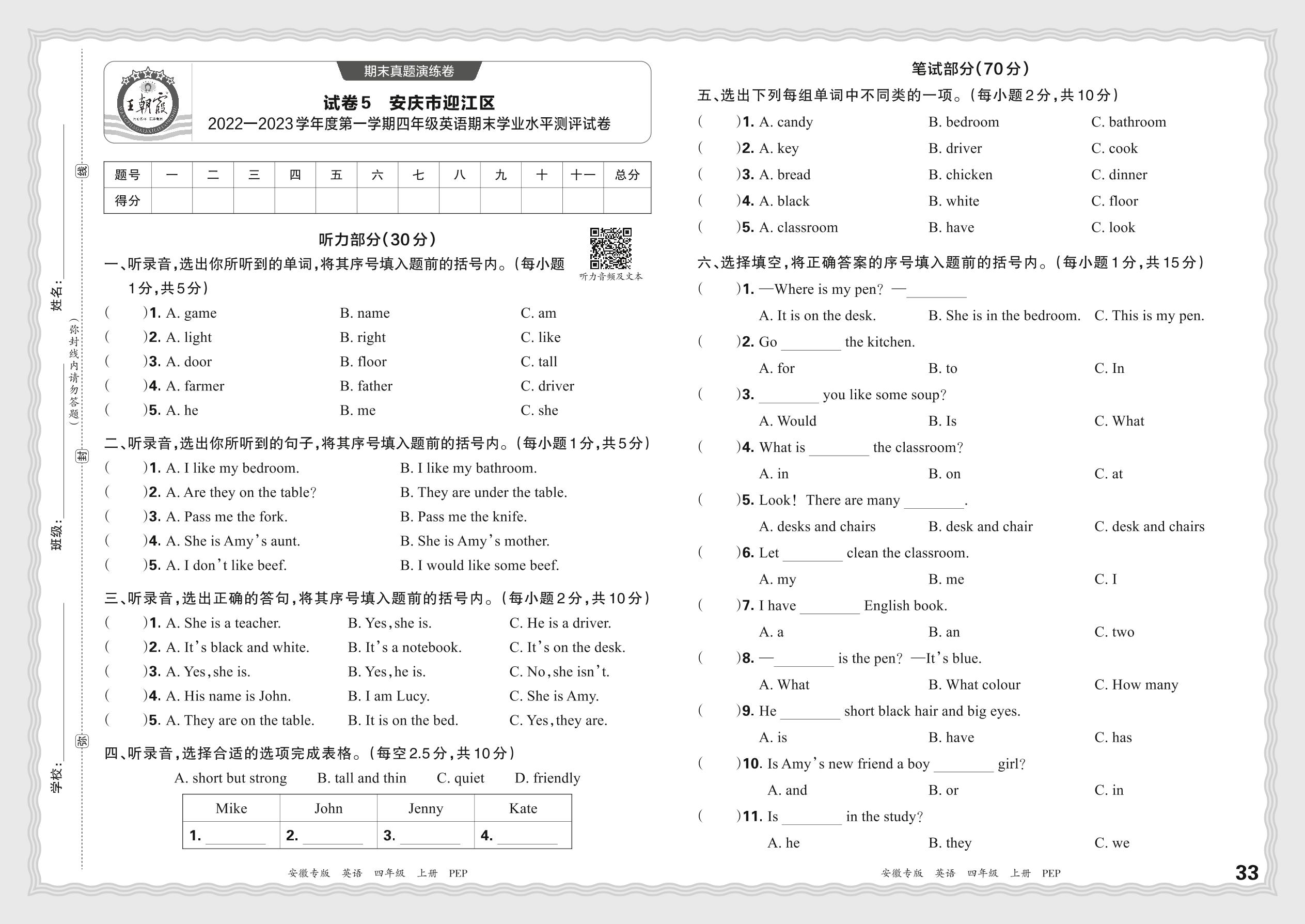 安徽省安庆市迎江区2022—2023学年度第一学期四年级英语期末学业水平测评试卷(PEP版)【5】