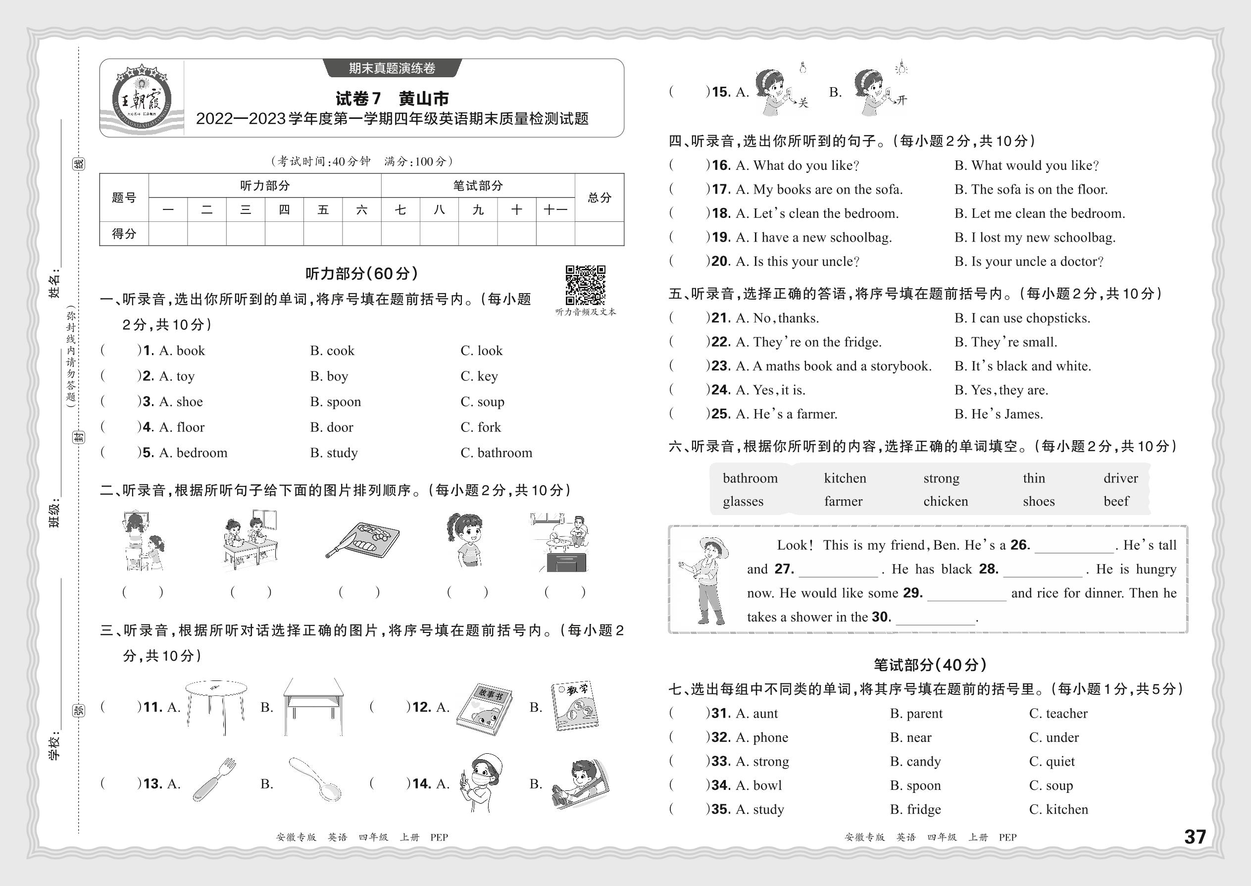 安徽省黄山市2022—2023学年度第一学期四年级英语期末质量检测试题(PEP版)【7】