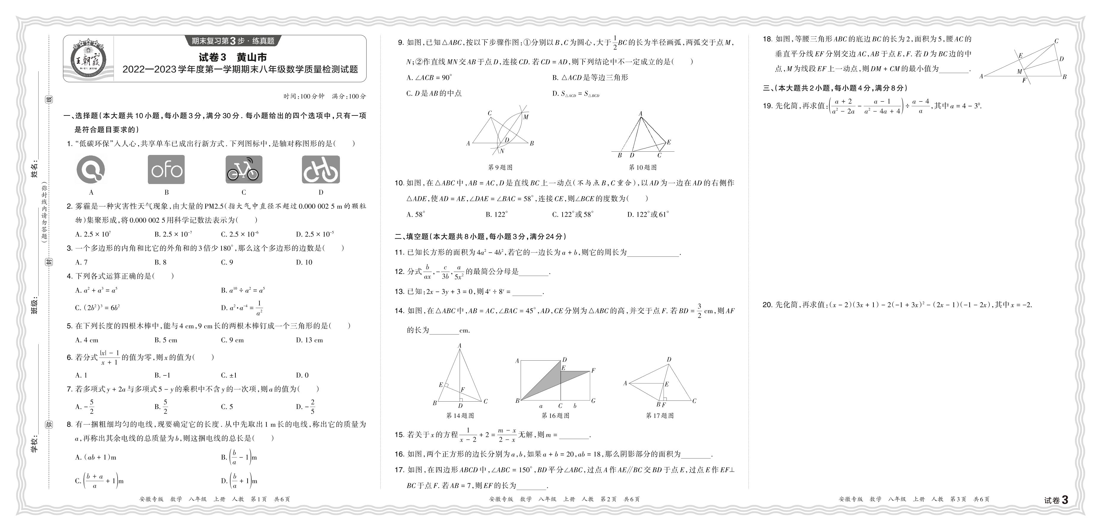 安徽省黄山市2022—2023学年度第一学期期末八年级数学质量检测试题(人教版)【3】