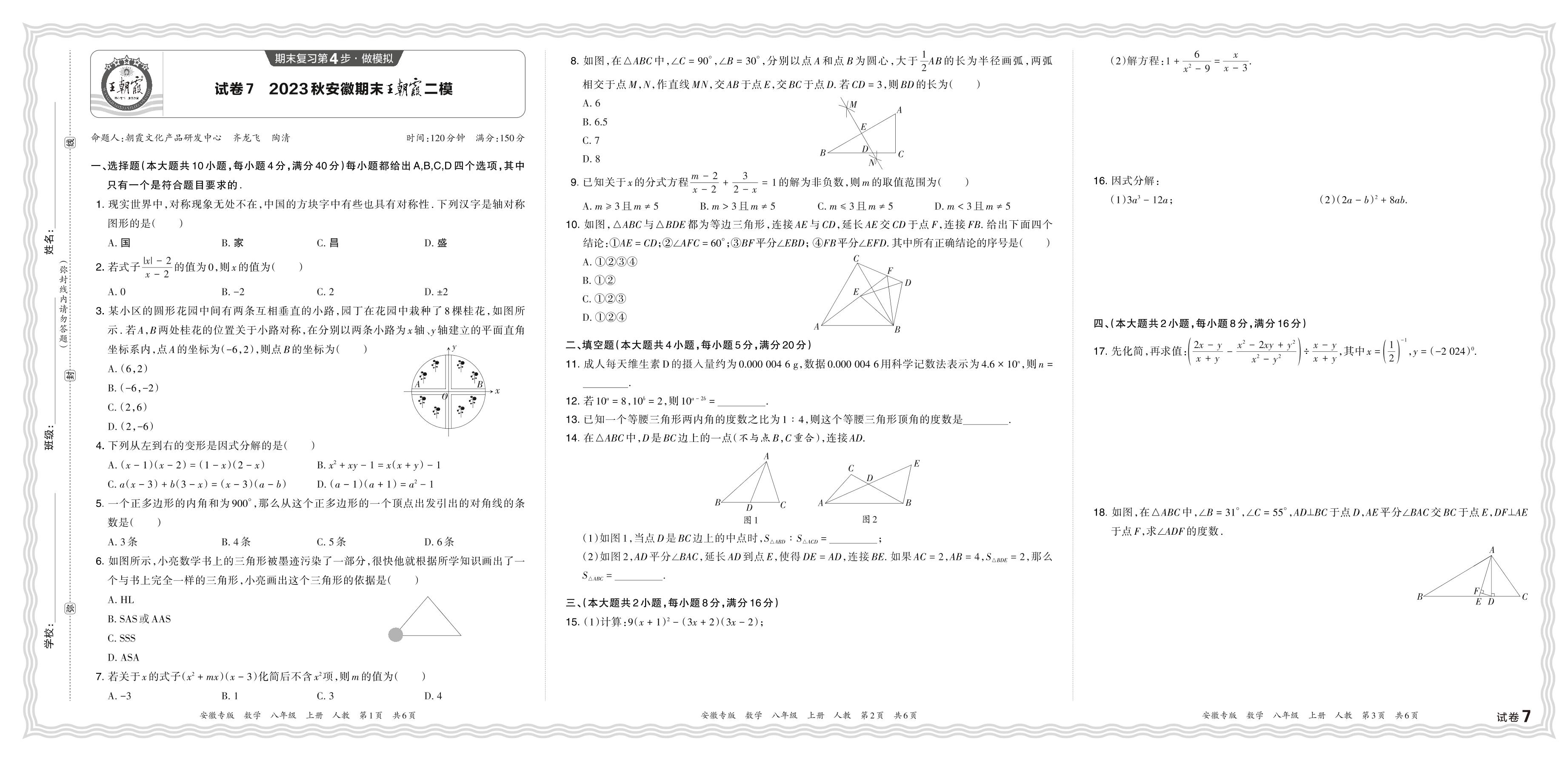 2023秋上册八年级数学人教版 安徽期末王朝霞二模