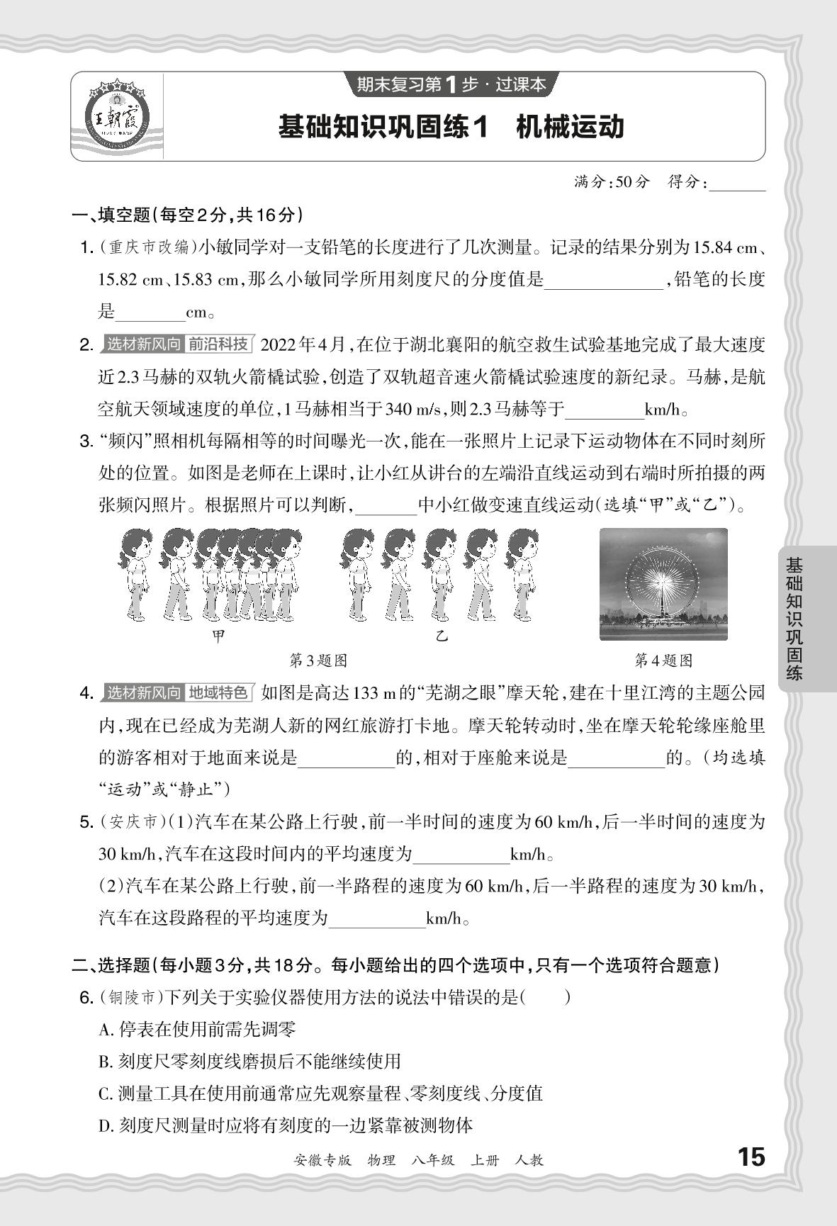 2023秋上册八年级物理人教版 期末过课本·基础知识巩固练 机械运动【1】