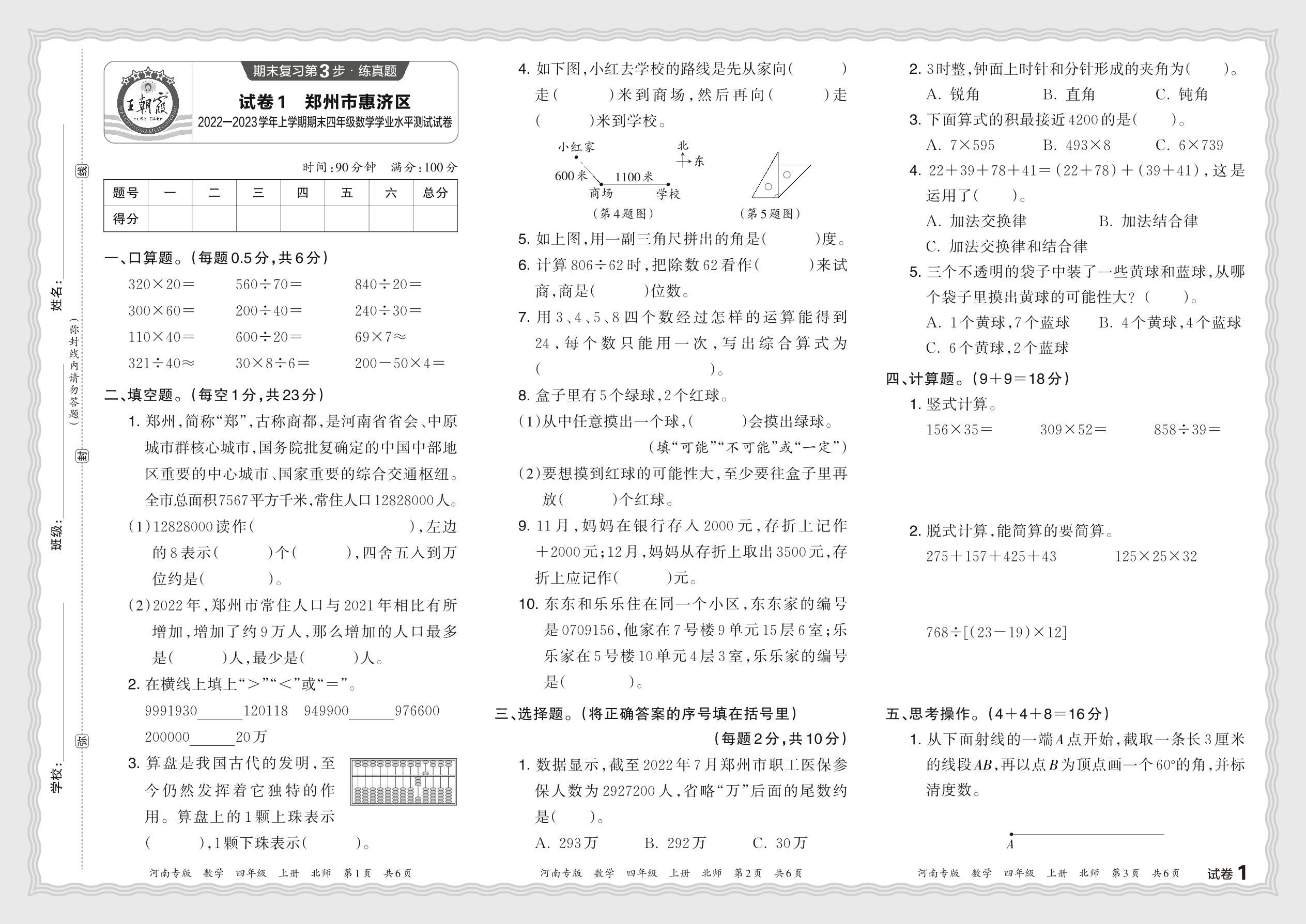 河南省郑州市惠济区2023—2024 学年第一学期四年级数学学情调研卷(北师版)【1】