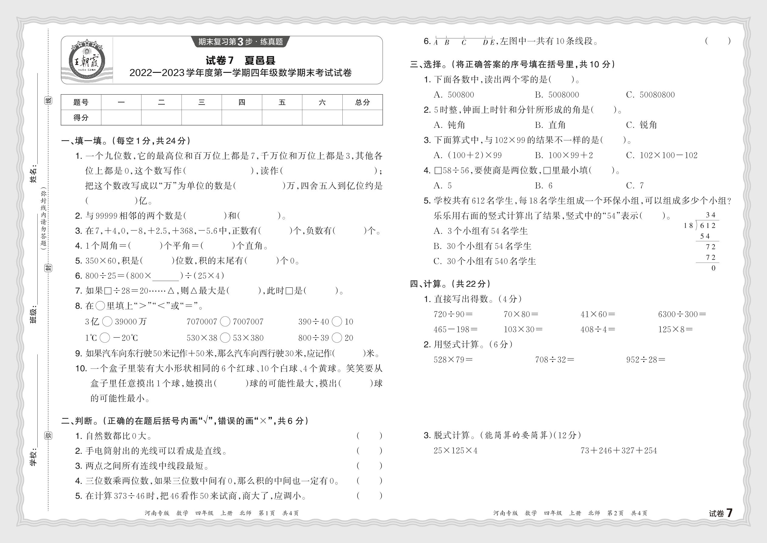 河南省商丘市夏邑县2022—2023学年度第一学期四年级数学期末考试试卷(北师版)【7】