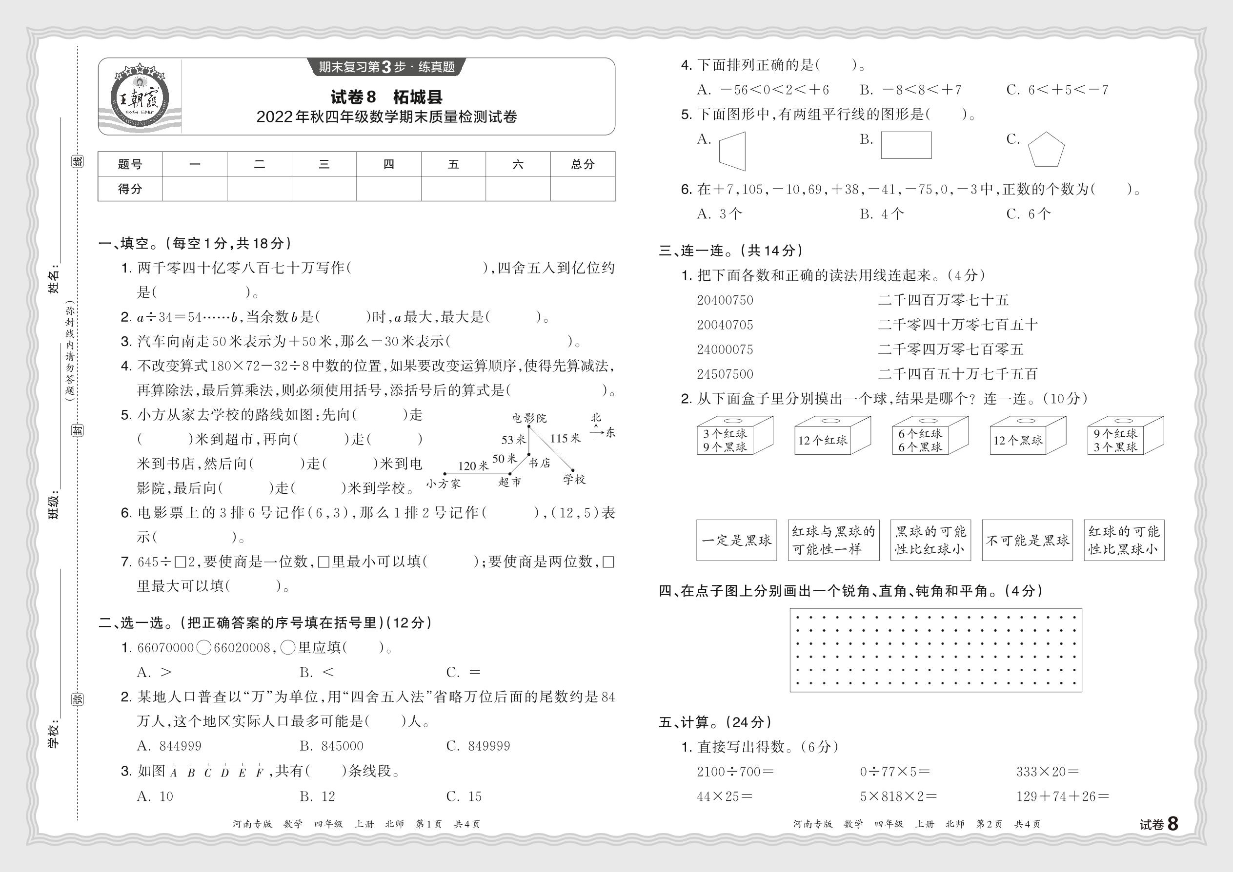 河南省商丘市柘城县2023—2024 学年第一学期四年级数学学情调研卷(北师版)【8】