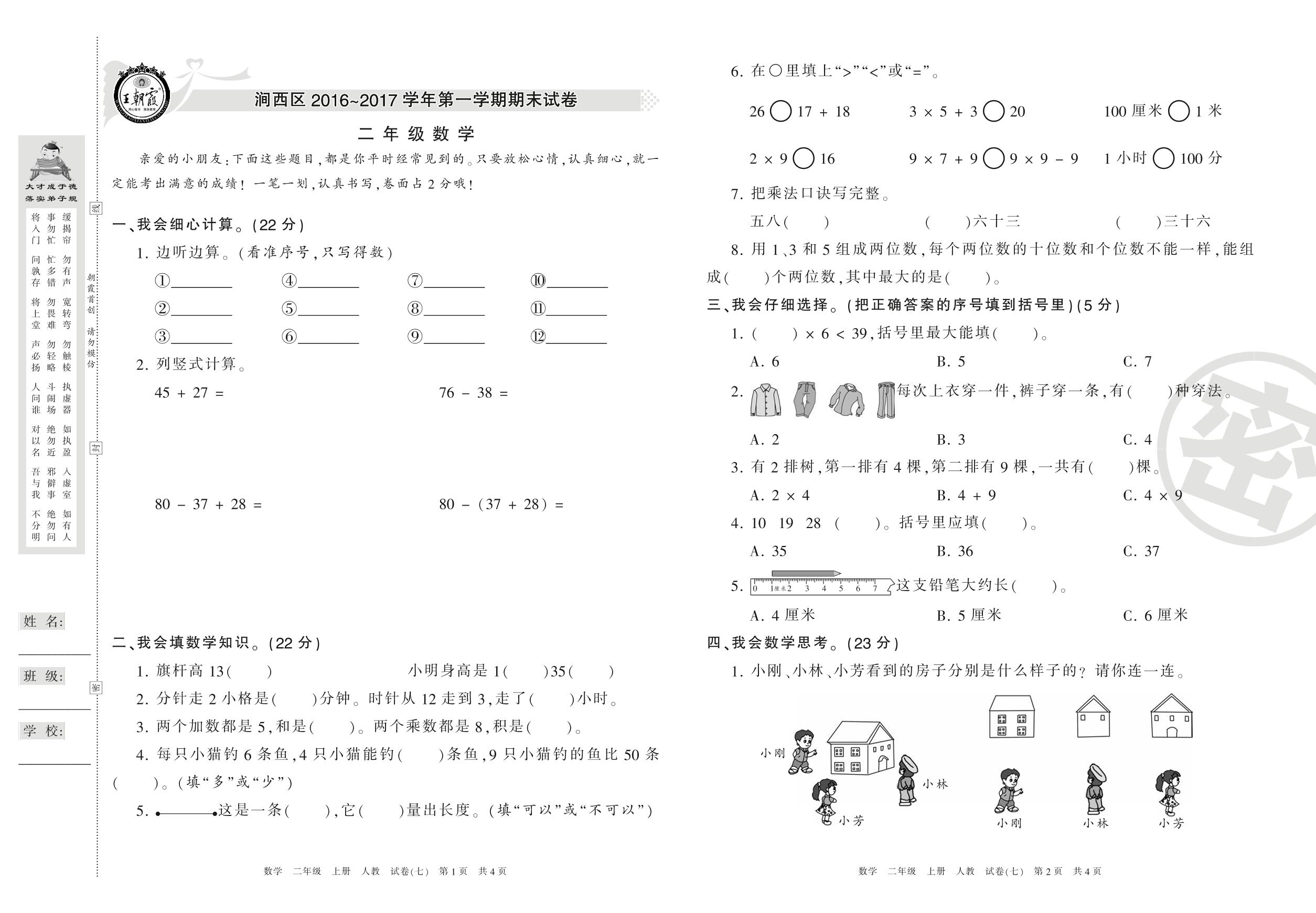 2016-2017学年第一学期洛阳市涧西区二年级数学试卷(人教版)【7】