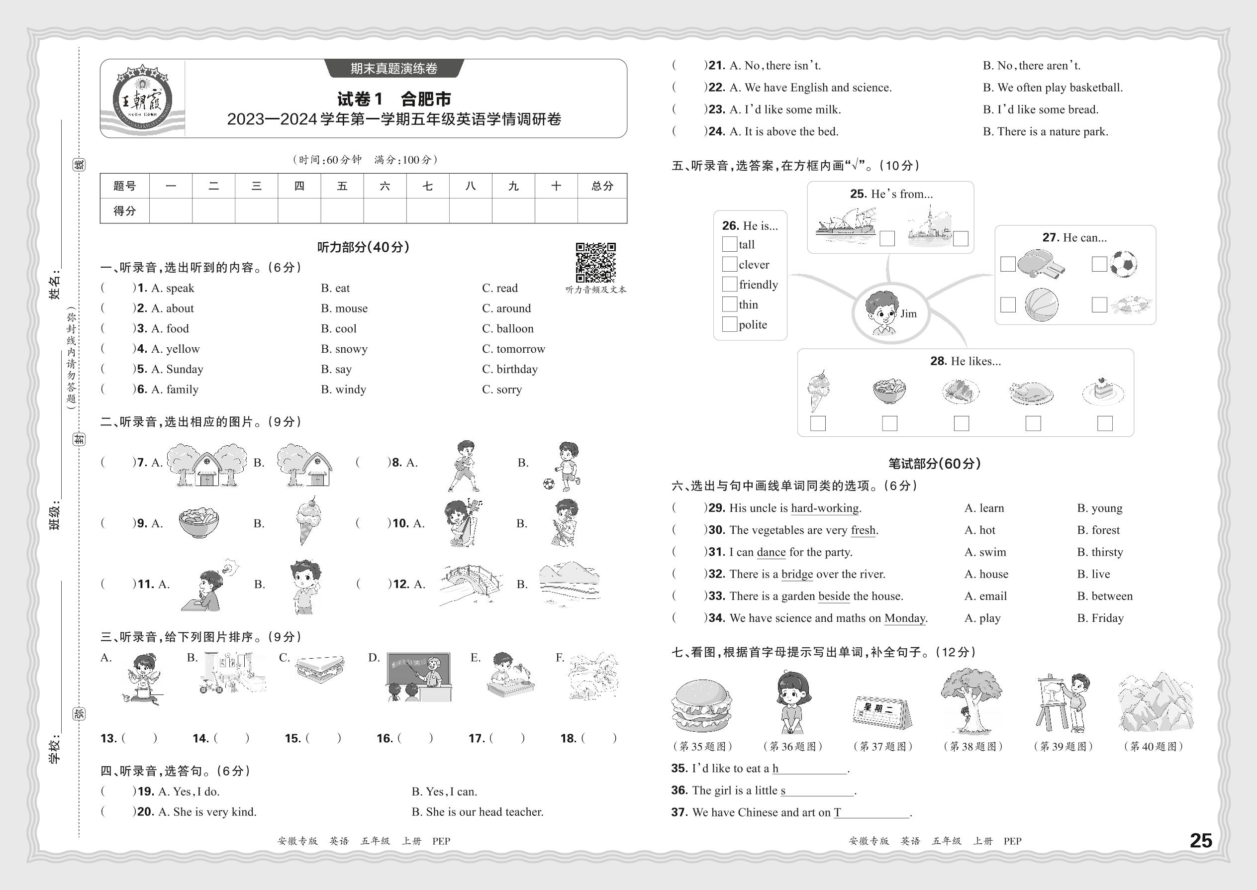 安徽省合肥市2023—2024学年第一学期五年级英语学情调研卷(PEP版)【1】