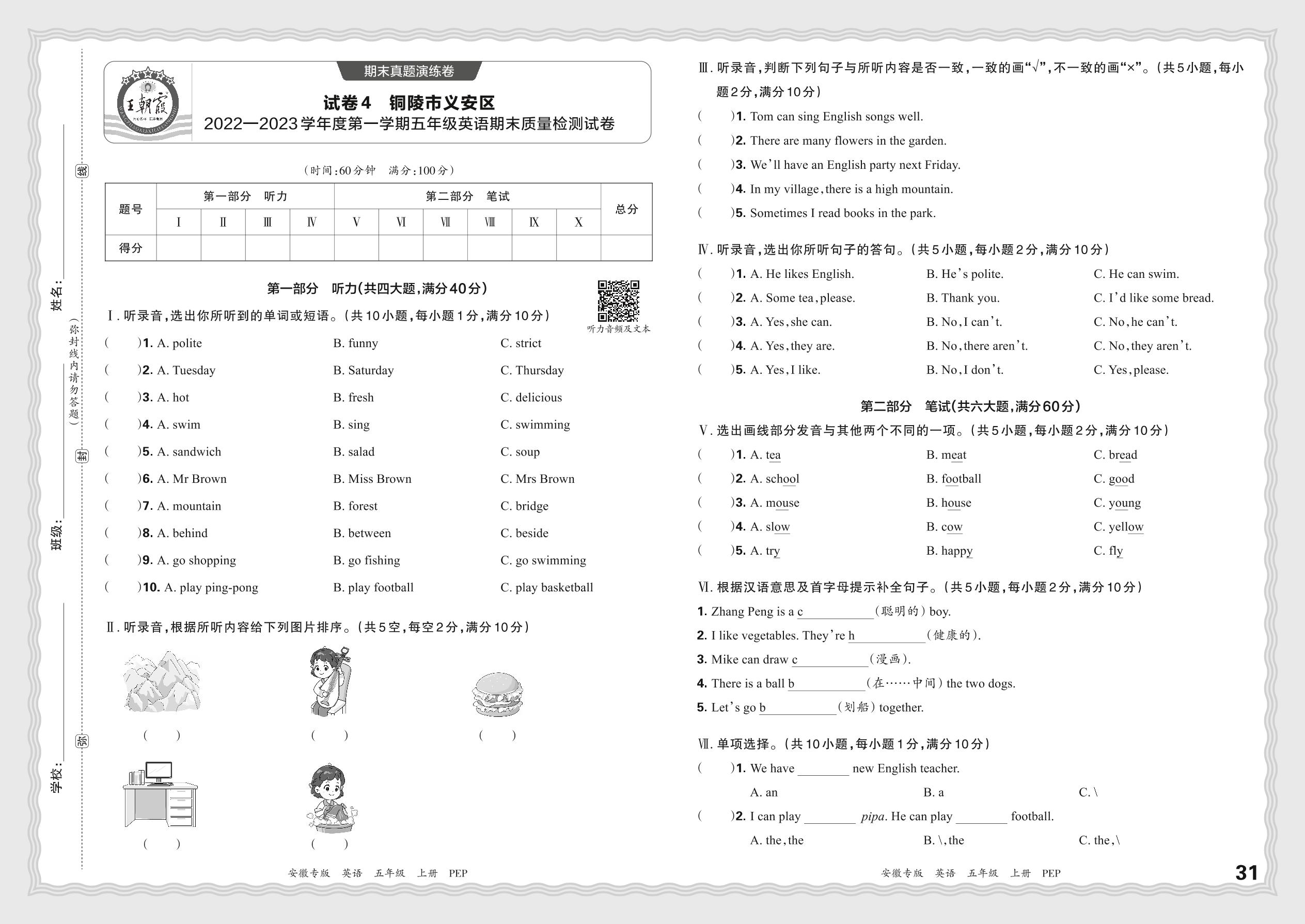 五年级英语人教PEP版(三起始)上册期末卷
