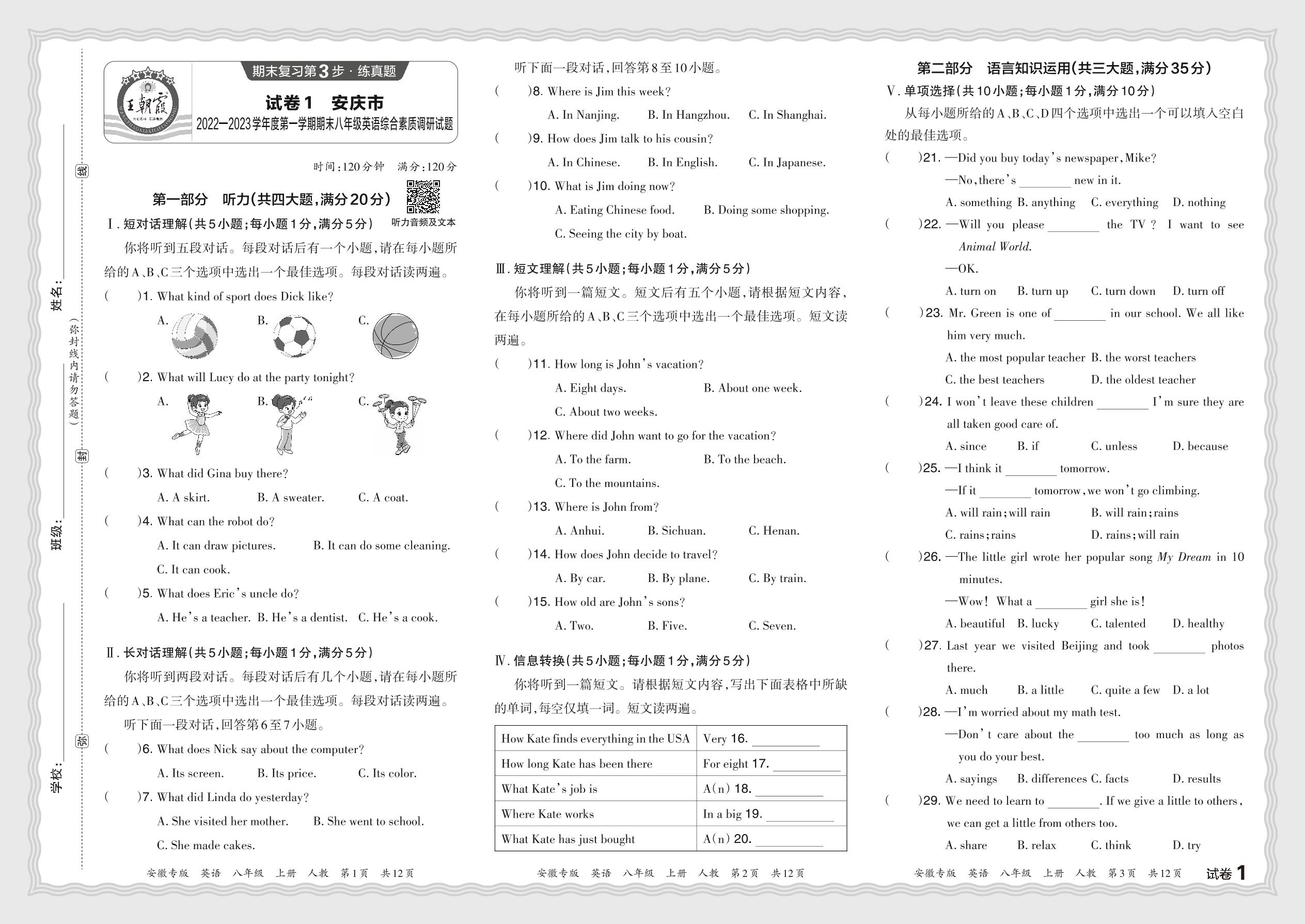安徽省安庆市2022—2023学年度第一学期期末八年级英语综合素质调研试题(人教版)【1】