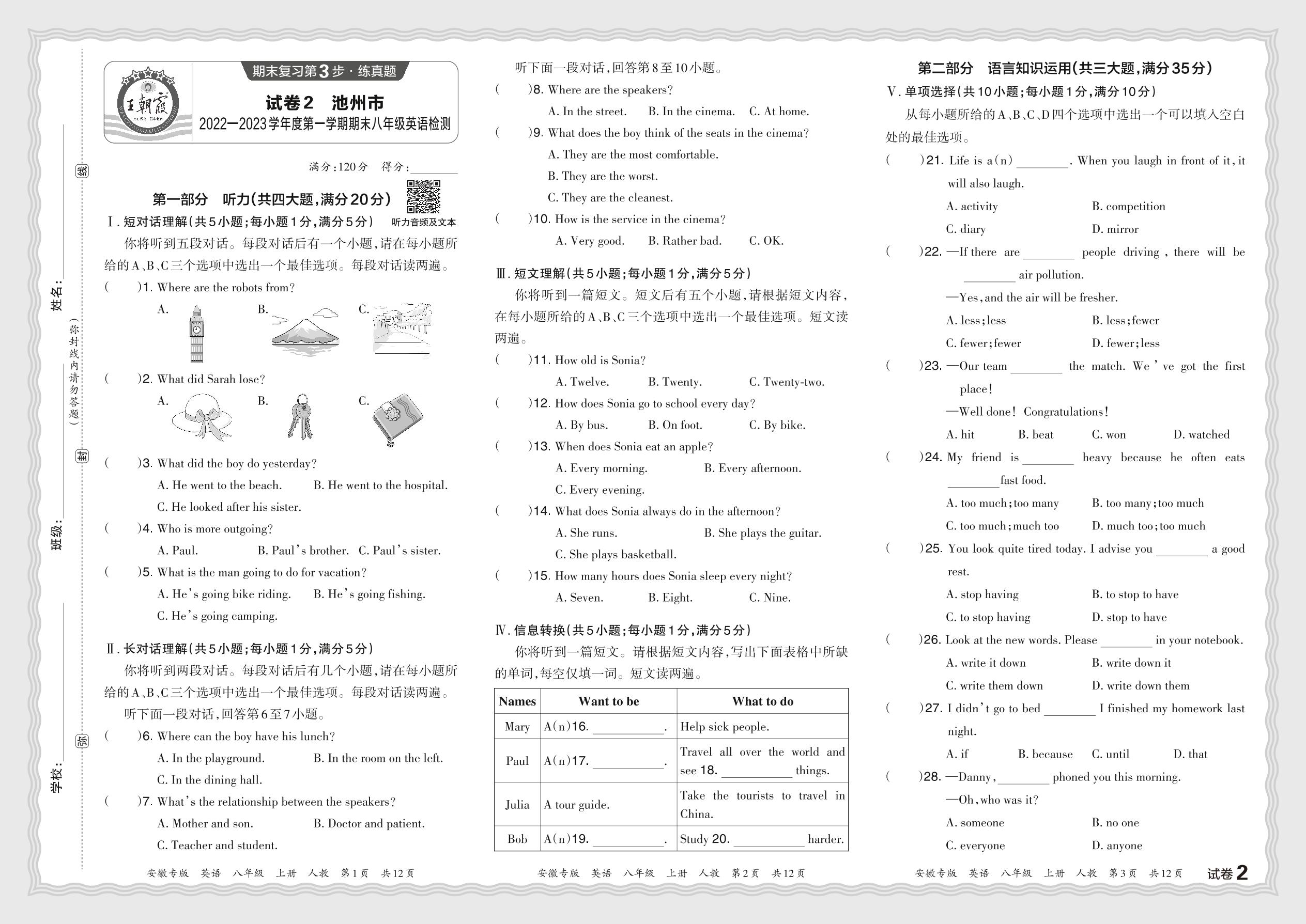 安徽省池州市2022—2023学年度第一学期期末八年级英语检测(人教版)【2】