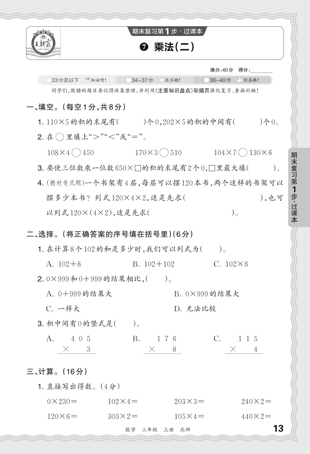 2023秋上册三年级数学北师版 期末过课本QMA版·乘法(二)【7】