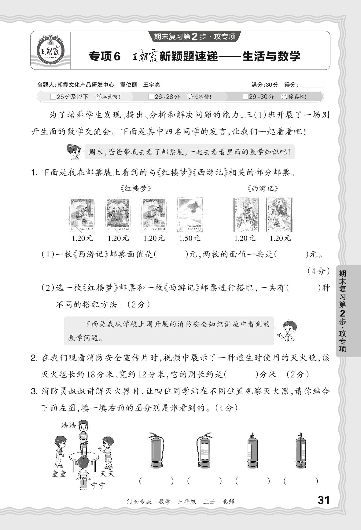 2023秋上册三年级数学北师版 期末专项卷·王朝霞新颖题速递——生活与数学【6】